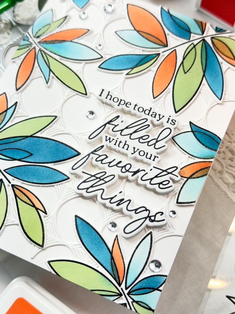 I decided on the placement of the sentiment and adhered that atop the card using SSS Foam Tape, and then determined the placement of the leaves. Those were then adhered using liquid glue, and the excess was trimmed off. To finish off the card, I added a few PFS Ice Clear Drops for a little bit of shine.