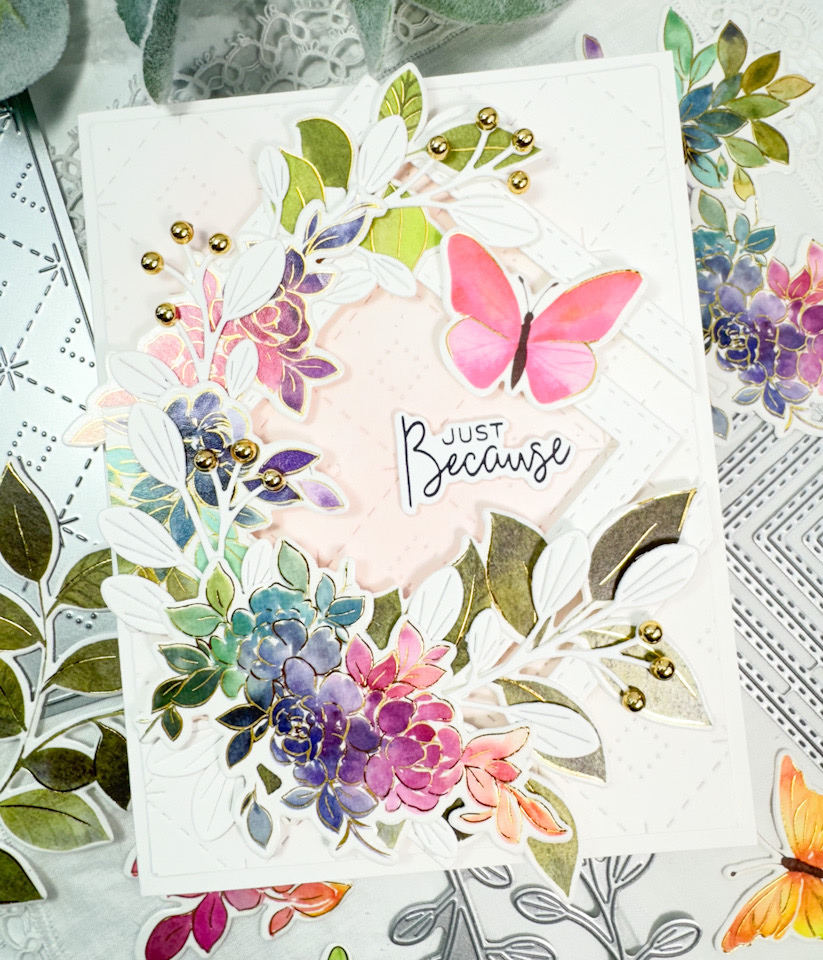 I used the PFS Sparkling Diamond to cut a panel of Neenah 110lb cardstock, and did some light ink blending using PFS Ballet Slipper ink. I also used the SSS Stitched Squares to cut some frames for interest. The squares were adhered to the ink blended panel using SSS 3D Foam Strips, and I then played around with the placement of the flowers to decide on the look of the card.