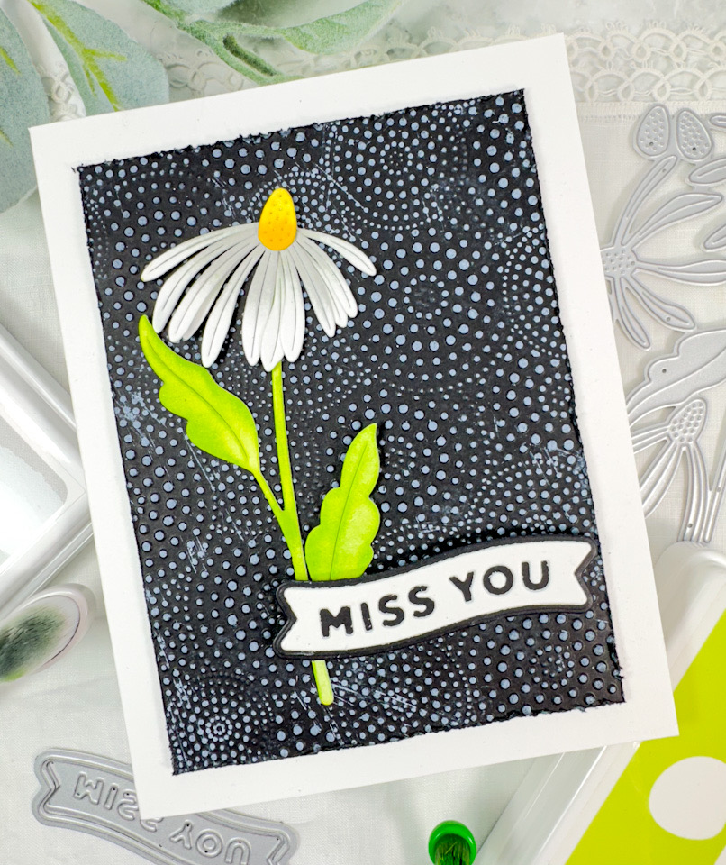 I used the miss you sentiment from the new SSS Little Banner Basics set, die cut the sentiment twice from Neenah 110lb cardstock, cut the shadow portion twice from black cardstock and adhered all of those pieces together with liquid glue. I adhered the black panel to the card base using foam tape, glued the flower pieces in place and adhered the sentiment atop that using SSS 3D Foam Strips.