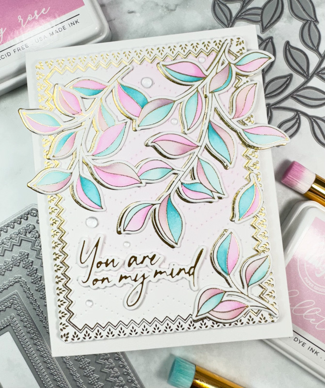 I adhered the ink blended leaves atop the gold leaves with liquid glue and also glued the chevron panel behind the frame. The leaves were then glued in place, along with the sentiment, and the panel was secured to the card base with foam tape for some added dimension. To finish up, I added a few clear drops.