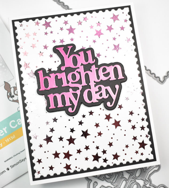 I used the SSS You Brighten My Day for the sentiment and cut that once from SSS Color Blend Cardstock and twice from black cardstock. I also cut the shadow portion twice and adhered all of the pieces together using liquid glue for a stacked sentiment.