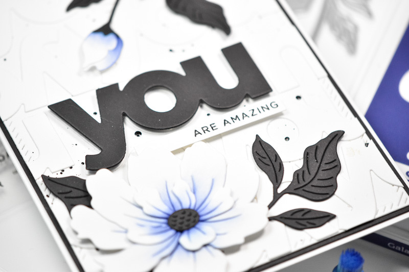 Once the ink blending was complete, I assembled the florals using liquid glue, and then decided that I wanted the leaves to be black, so I went back and cut those. To begin assembly, I cut a panel of Neenah 110lb cardstock using the PFS Diagonal Stitched Rectangles and splattered it using black acrylic ink. When that was dry, I began adhering the You die cut to cover the panel and trimming off the excess.