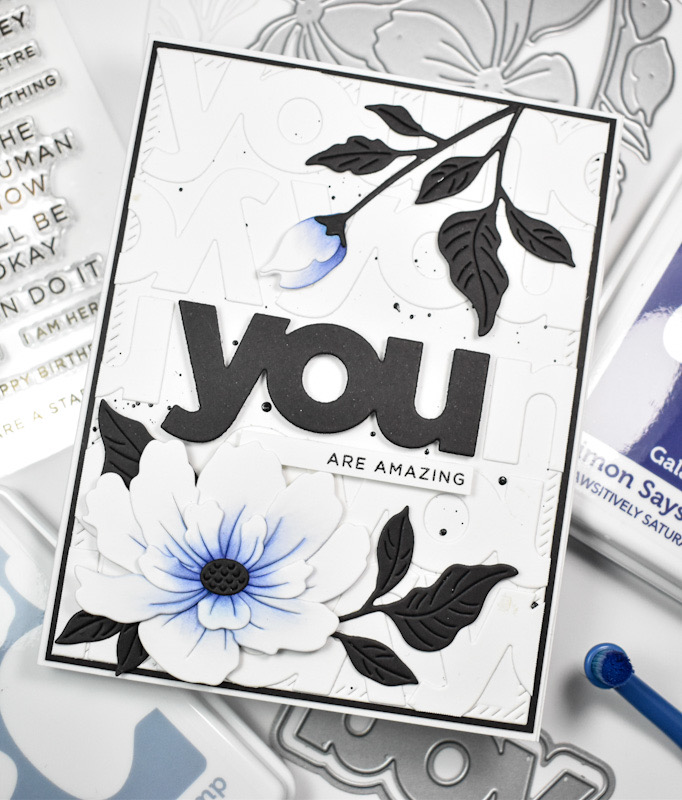 I adhered the leaves in place and then adhered the larger flower using SSS 3D Foam Strips for added dimension. The card was missing something, so I cut the You from black cardstock and adhered that using foam strips, and that brought things together, in my opinion. I then used the new SSS You Stamp set and stamped the sub-sentiment using VersaFine Onyx Black ink, heat set that using Ranger Clear Embossing Powder and adhered it with the same foam strips.