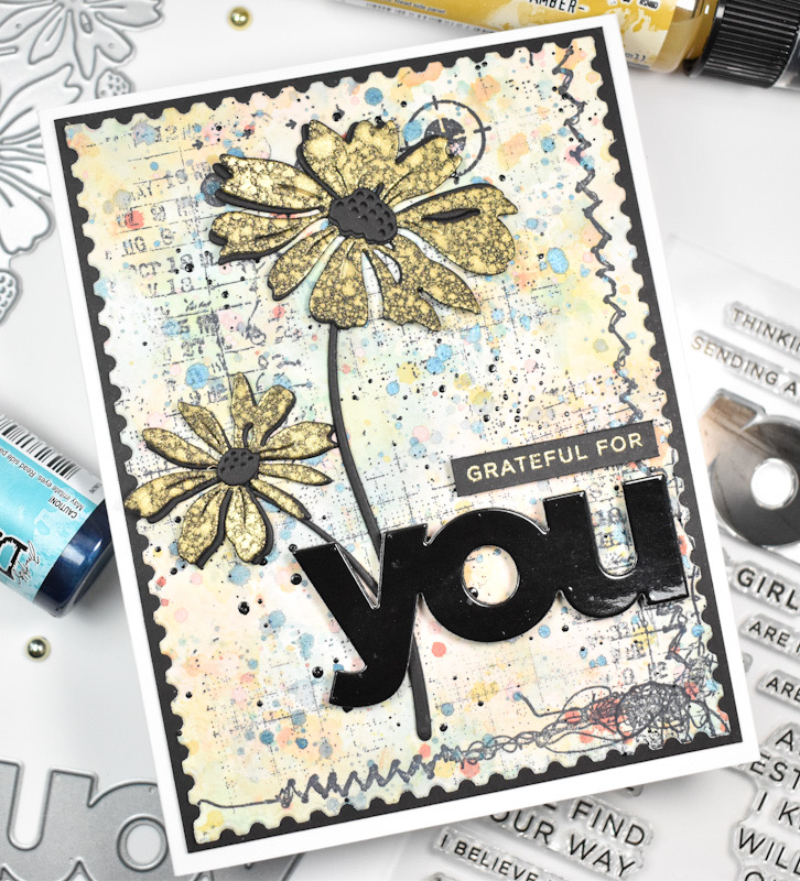 I die cut the SSS Cosmos Duo twice from black cardstock and used the Fossilized Amber Distress Spritz on one set. Once the pieces were dry, I adhered them together using liquid glue. I also die cut the You twice from black cardstock and once from black glossy cardstock and adhered those together as well. The small sentiment is from the You stamp set, and that was stamped onto black cardstock with VersaMark Ink and heat set using Ranger Princess Gold Embossing Powder.