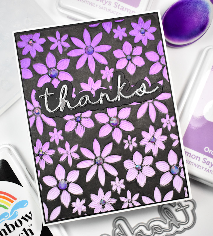 I then trimmed the panel down and adhered it to a black panel using foam tape for added dimension. I cut the Simple Thanks once from silver cardstock, twice from black cardstock, and I cut the shadow portion twice as well. Those pieces were all adhered together using liquid glue before before being glued to the panel. I thought the card needed a little bling, so I added some PFS Purple Gems to the centers of the flowers.