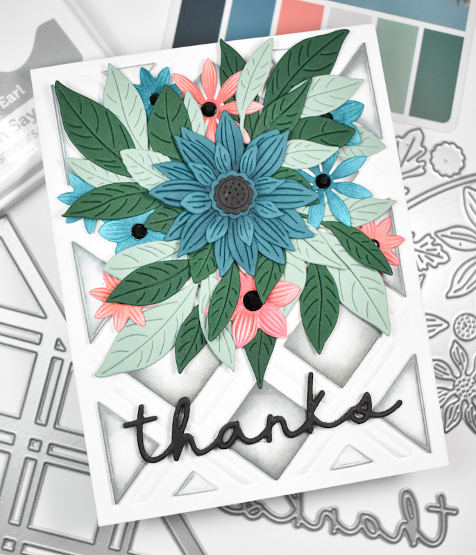 I then cut the larger flower using the Rustic Layering Flower and ink blended that using that same Peacock ink before assembling the pieces. As always, I need leaves to go with my flowers, so I used the Arching Leaf Border set and cut those from a sage and pine colored cardstock. While die cutting, I went ahead and die cut the Simple Thanks four times from black cardstock, and adhered all of those together with liquid glue.