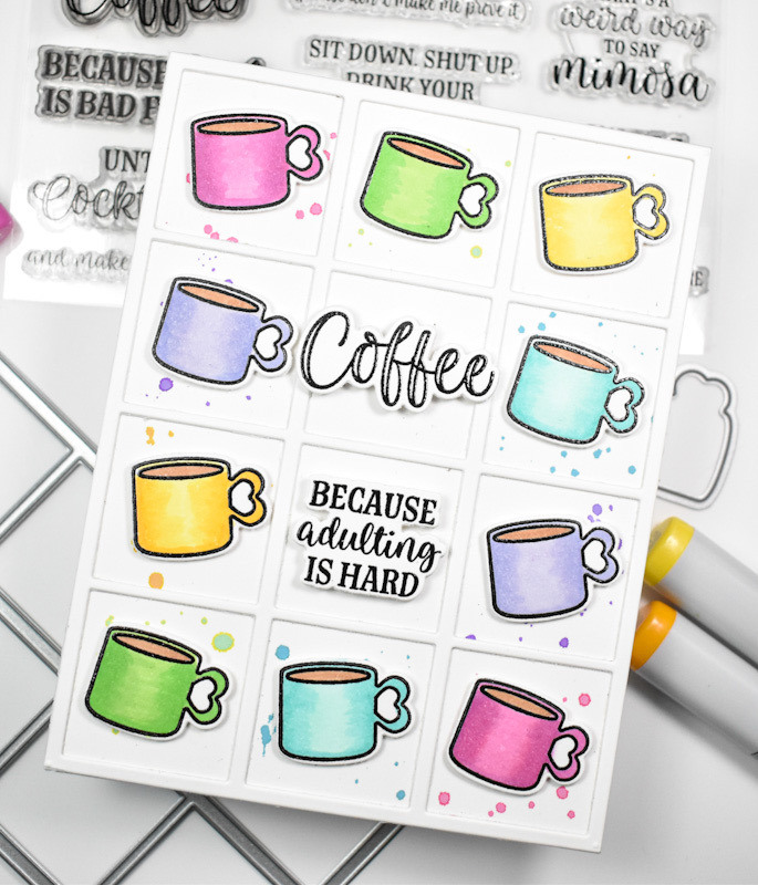 Once all of the mugs were cut, I got busy coloring them using Copic Markers in RV55, V05, Y13, Y17, YG13, G14, BG11, BG13, BV00, BV02 and E23. I also die cut the SSS Artwork Grid Plate twice from Neenah 110lb cardstock and adhered those to the card base using liquid glue. As I was playing around with the layout of the card, I decided that it would be super cool if each square had a corresponding color of splatter. For some reason, I must like making things hard for myself!