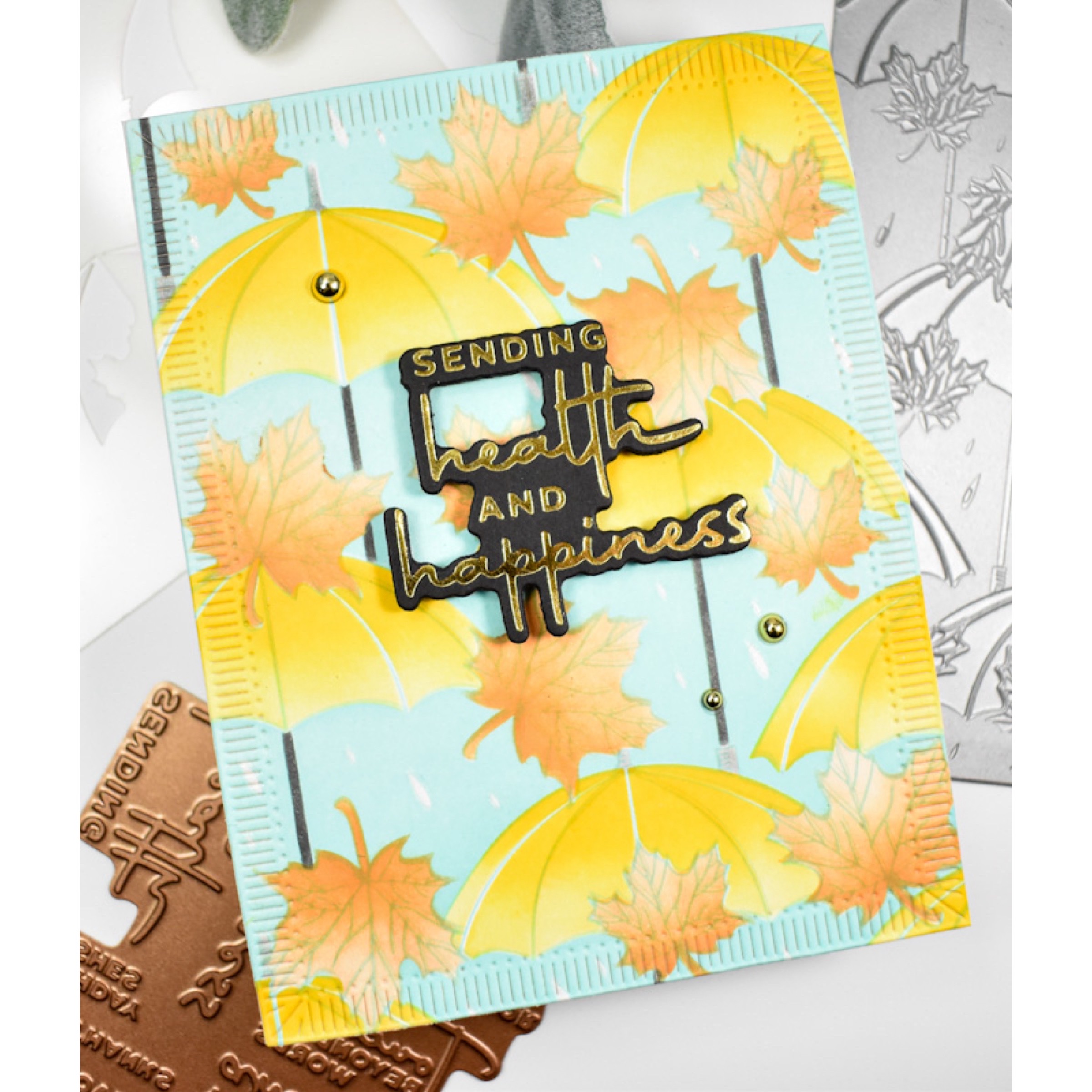 I began this project by inking up the Autumn Rain plate with Seafoam ink and then using the stencil to add color to the leaves and umbrellas using Sunbeam, Citrine, Melon and Cantaloupe ink. Once the ink blending was complete, I trimmed the panel using Fluted Classic Rectangles. I should mention that the color added to the handles of the umbrellas was leftover ink on a grey blending brush.
