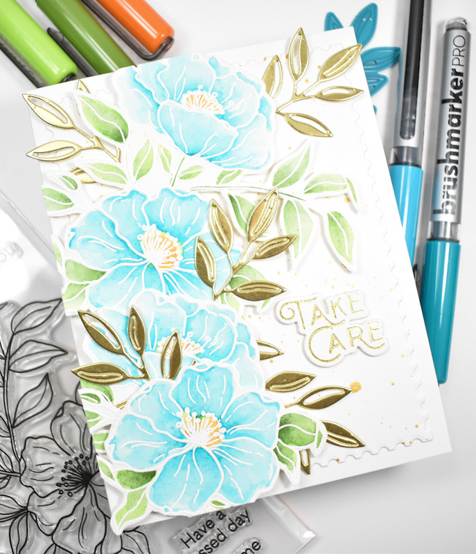 The splattered panel was adhered to the card base, and I began deciding on the layout for the card. As I always say, I needed more leaves, so I cut some gold leaves using Alex Syberia Designs Classic Foliage set. I glued the leaves in place and adhered the florals with foam tape for added dimension. I worked my way from the top of the card to the bottom, tucking in the leaves along the way.
