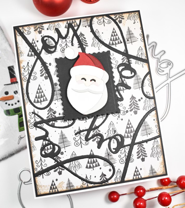 The black square was adhered to my panel using foam tape and the Santa was adhered atop that with more foam tape for lots of dimension. This was then adhered to a black panel for contrast before being adhered to the card base to finish up.