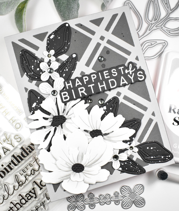Before adhering the leaves to the panel, I splattered them with white acrylic ink. I then adhered the florals in place with black foam squares. I stamped the sentiment, which is from the Birthday Basics set, using VersaMark ink and heat set that using Detail White Embossing Powder. The coordinating die was used to trim it out, along with two additional cuts for a stacked sentiment. That was then added to the card using foam strips, along with a few more embellishments to finish up.