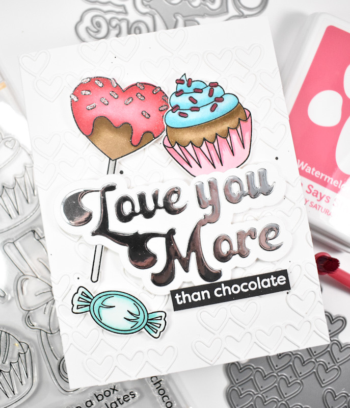 Once all of the color was added, I trimmed them out. I did decide to add a touch of sparkle to the lollipop sprinkles using a Ranger Emboss It Pen and Simon Detail Sparkle Embossing Powder. I die cut the Groovy Love You More sentiment once from silver cardstock and cut the shadow portion once from Neenah and adhered those pieces together. I knew that I wanted to add the sub-sentiment, so I stamped that onto black cardstock using VersaMark ink and heat set it using Detail White Embossing Powder. The sentiment actually says ‘more than chocolate,’ but I trimmed off the ‘more’ part.