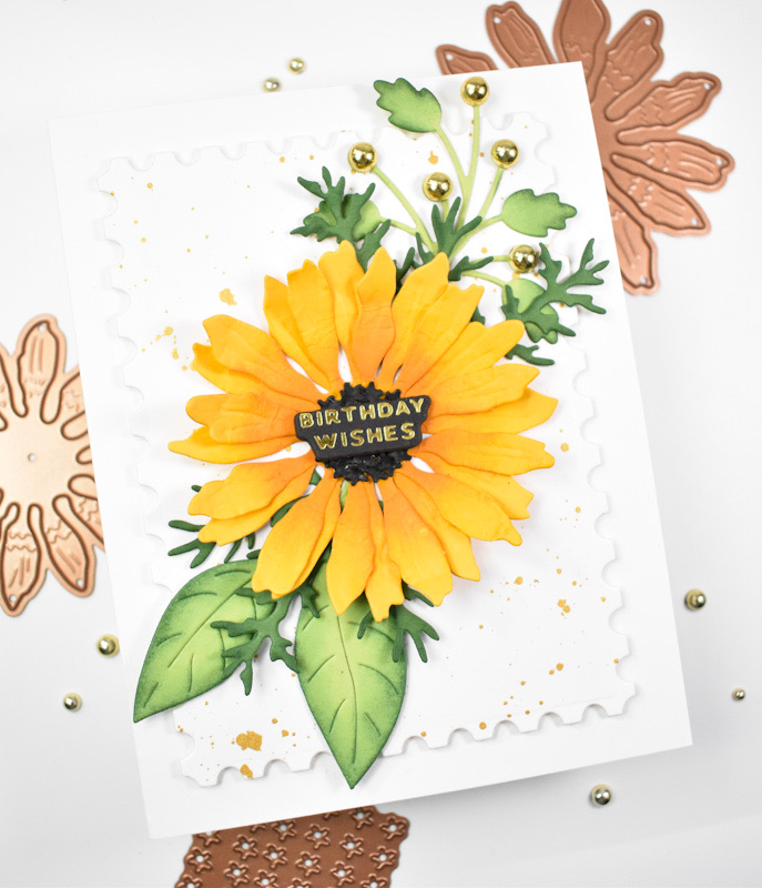 Once the ink blending was complete, I assembled the flower using liquid glue. The center portion of the flower did take some time, but I absolutely love the texture! The sentiment that was used is from the Making Me Smile Sentiments Hot Foil set and that was gold foiled onto black cardstock. I used the included die cut to trim it out along with two additional cuts for a stacked sentiment.