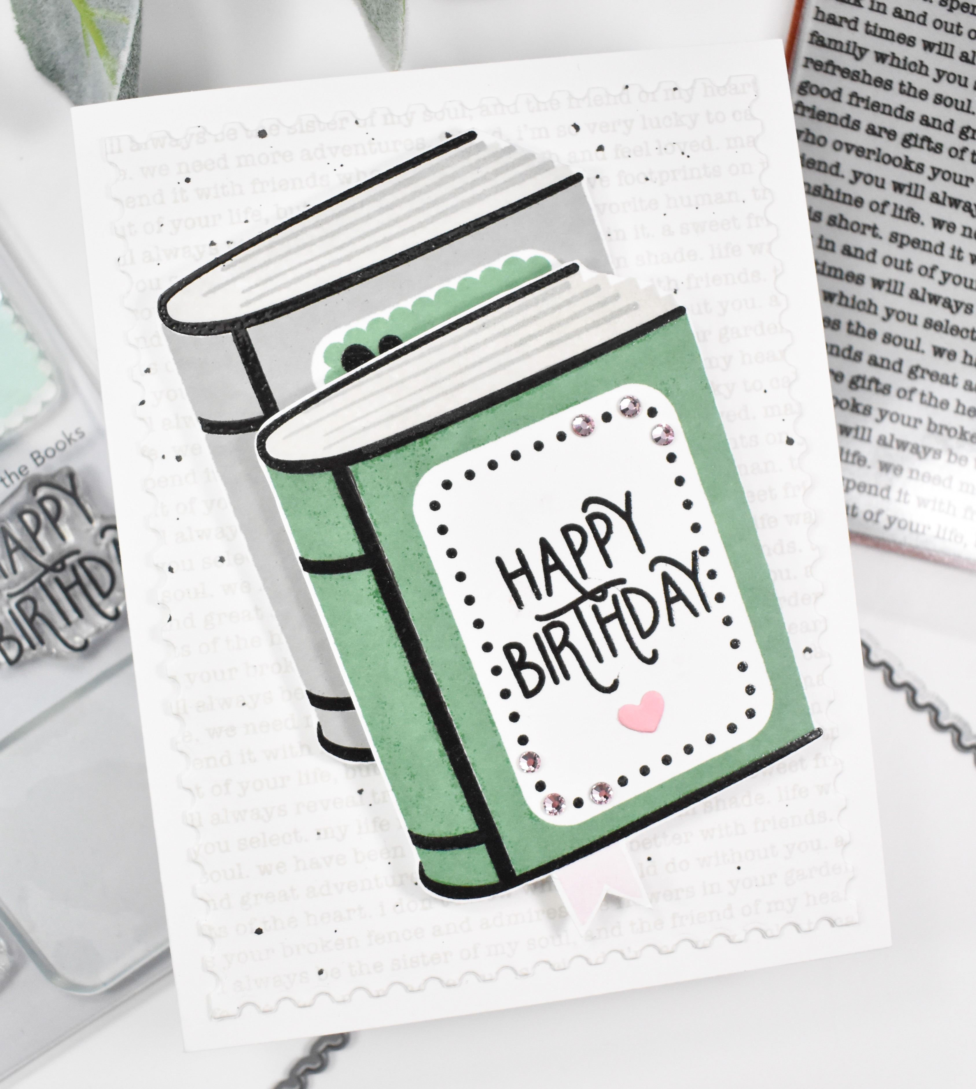 Once the stamping of the book was complete, I adhered them to fun foam and trimmed them down to size. I also added a small pink heart and Bubblegum Dazzling Gems to the top book. The background was created using the Friendship Text Background stamp with that same Misty Coast ink. That was then trimmed down using the Postage Stamp Edge Frames. Before adhering to the card base, I added some black splatter and then adhered the books atop that. Because the books had already been adhered to fun foam, there was no need for additional foam tape.