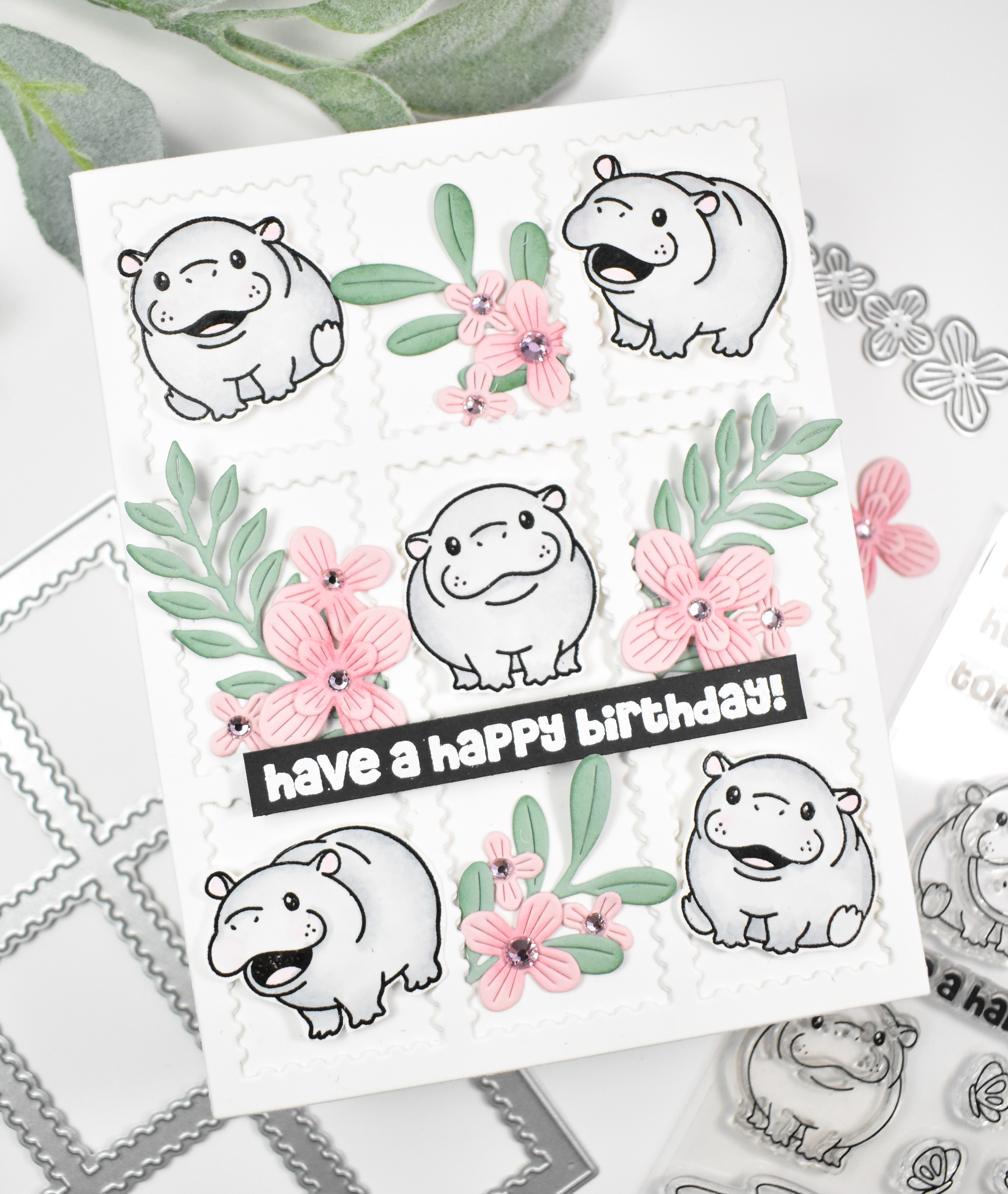 Once the ink blending was complete, I assembled the flowers and added Bubblegum Dazzling Gems to the centers. The sentiment, which is from the Hip Hip Hooray set, was stamped with VersaMark ink and heat set using SSS Detail White Embossing Powder. This was then cut into a strip with foam strips added to the back of it. The hippos were adhered using foam tape while the flowers and leaves were adhered with a combination of glue and foam squares. The sentiment was secured in place to finish up.