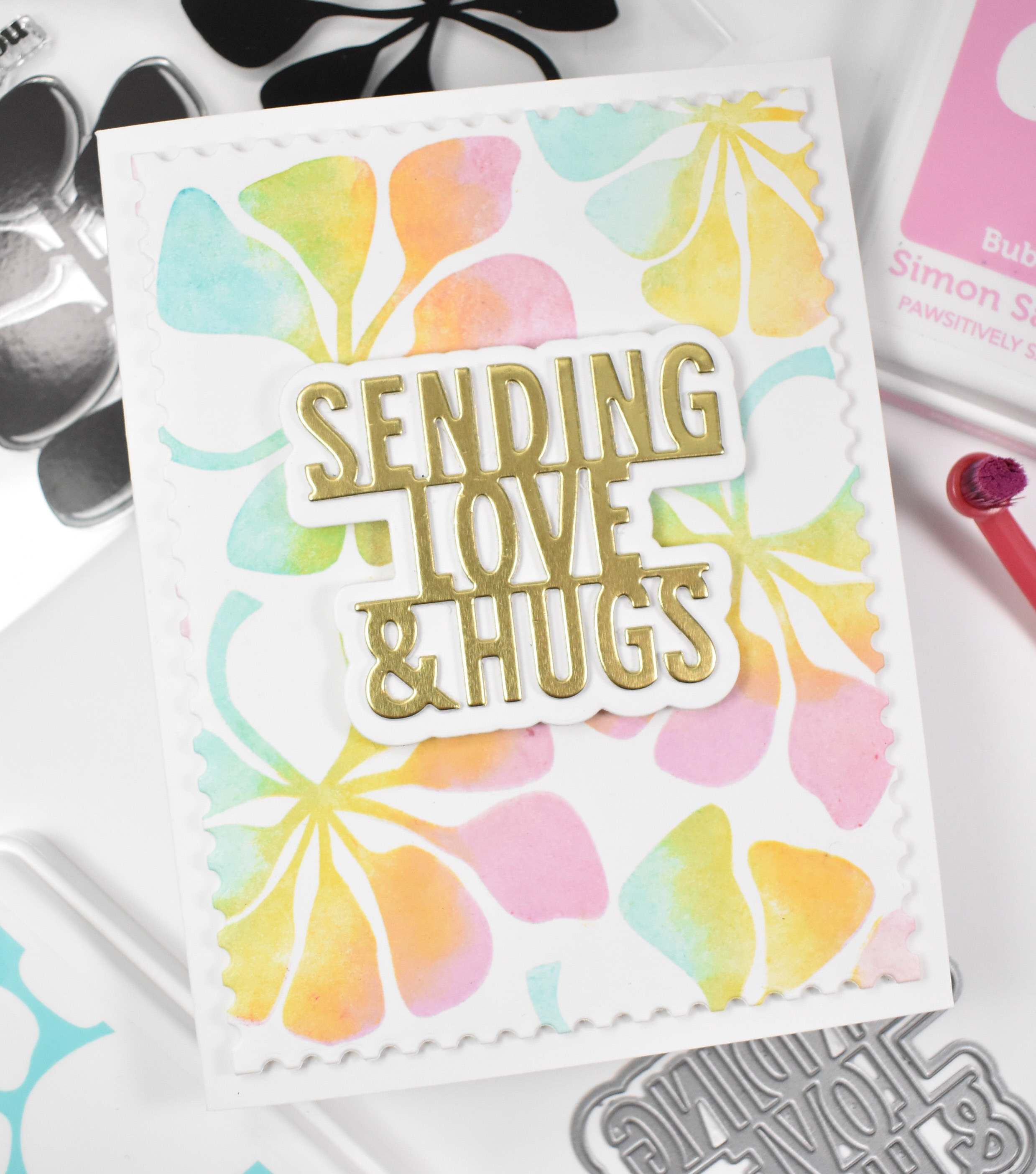 Once I was finished with one leaf, I moved it to the next area on my panel and repeated those stamping steps each time. When finished, I used the Postage Stamp Edge Frames to trim the panel down. This was then adhered to the card base using foam tape. The Sending Love & Hugs sentiment was cut once from gold cardstock and twice from Neenah 110lb cardstock, and the shadow portion was also cut twice. All of those pieces were adhered together using liquid glue and then added to the card with foam strips to finish up.