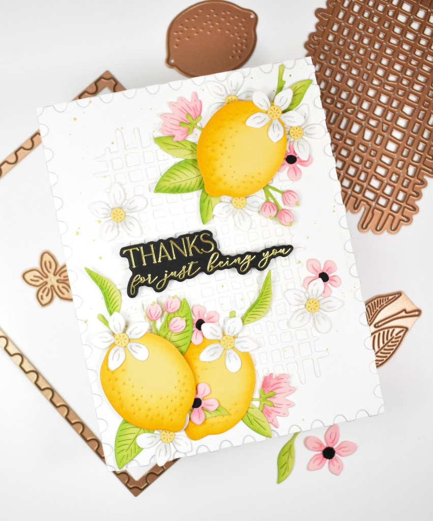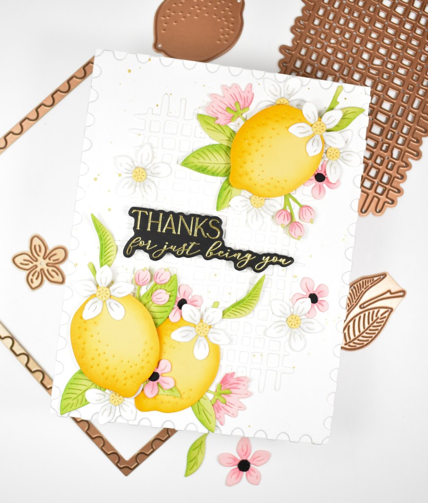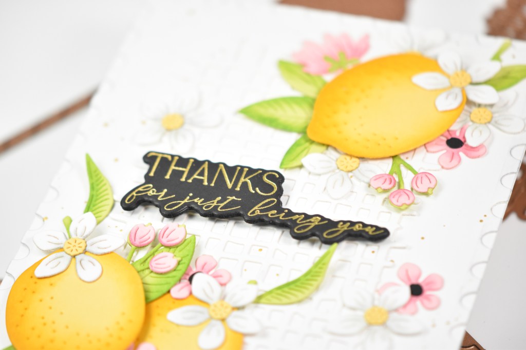 The postage layer was adhered to the card base and the lattice was glued into place. I began adhering the leaves and flowers in place first, along with the first lemon, and then adhered the last two lemons using foam strips. The sentiment was gold foiled onto black cardstock and adhered to the card using the same foam strips for a bit of added dimension.