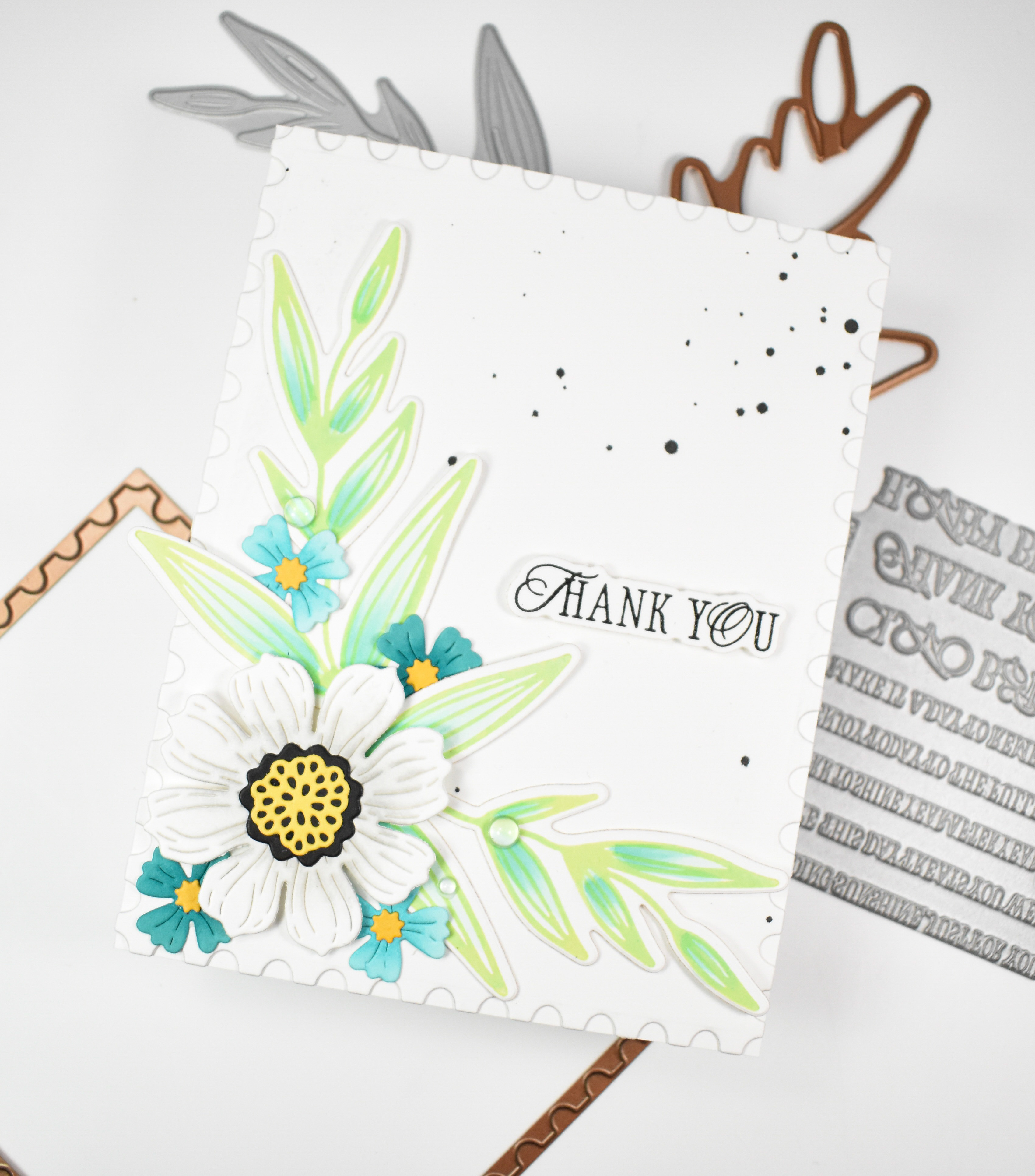 I then did some die cutting using the Vivid Blooms set from Neenah 110lb cardstock, as well as Waterfall, Teal Topaz, Beeswax and black. I did some light ink blending on the flowers before assembling them using the same Seafoam ink along with PFS Misty Coast ink. Before the assembly of the card, I cut a panel using the Nested Postage Labels & Tag and black splattered that.