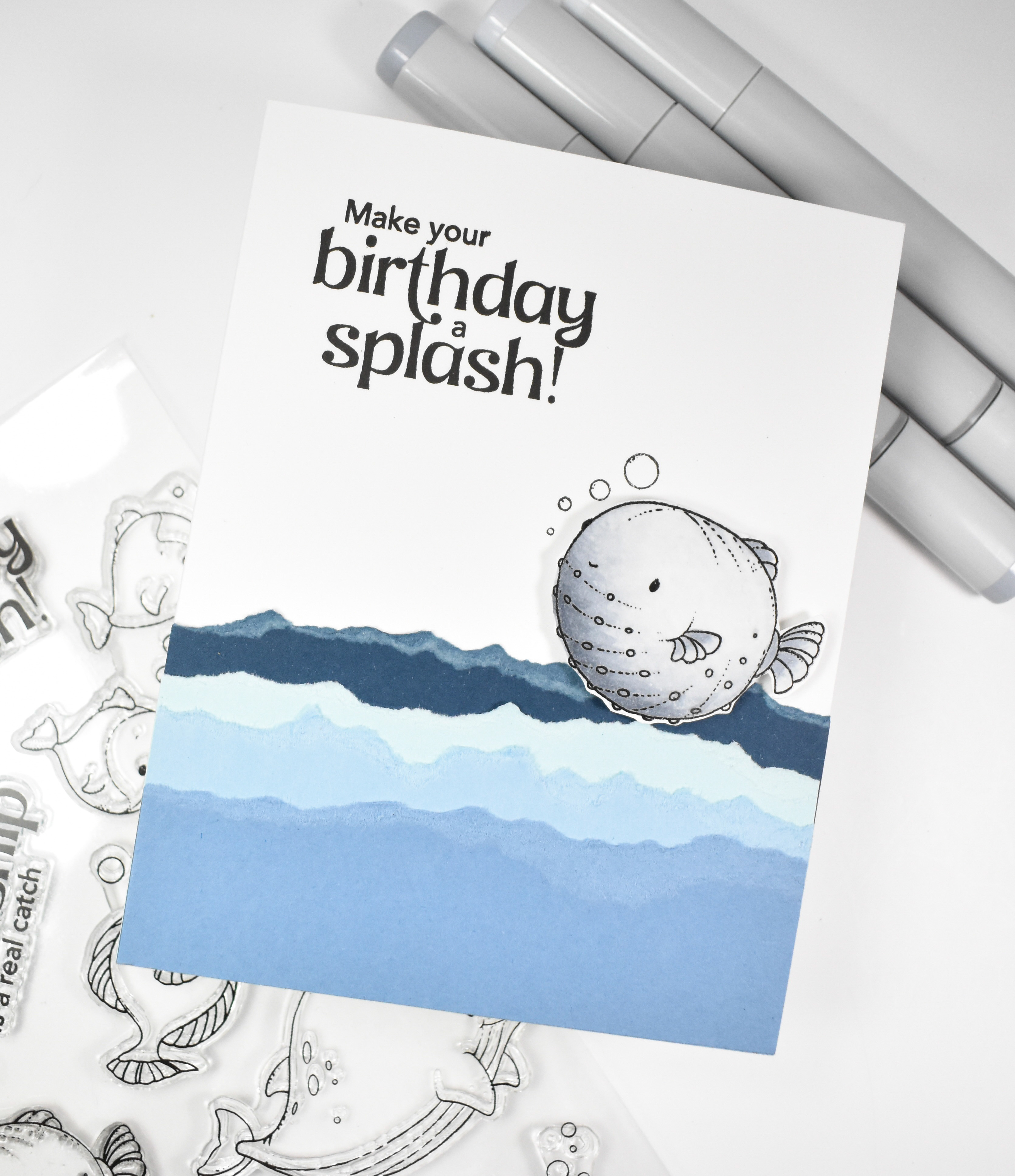 There is a die set that does with these stamps, but I did not have that, so I fussy cut my image. I then pulled some blue cardstock from my stash and cut those to fit my card base and tore the top edges to resemble waves. I stamped the sentiment and the bubbles directly onto the card and glued my blue layers in place, while the fish was adhered using foam strips.