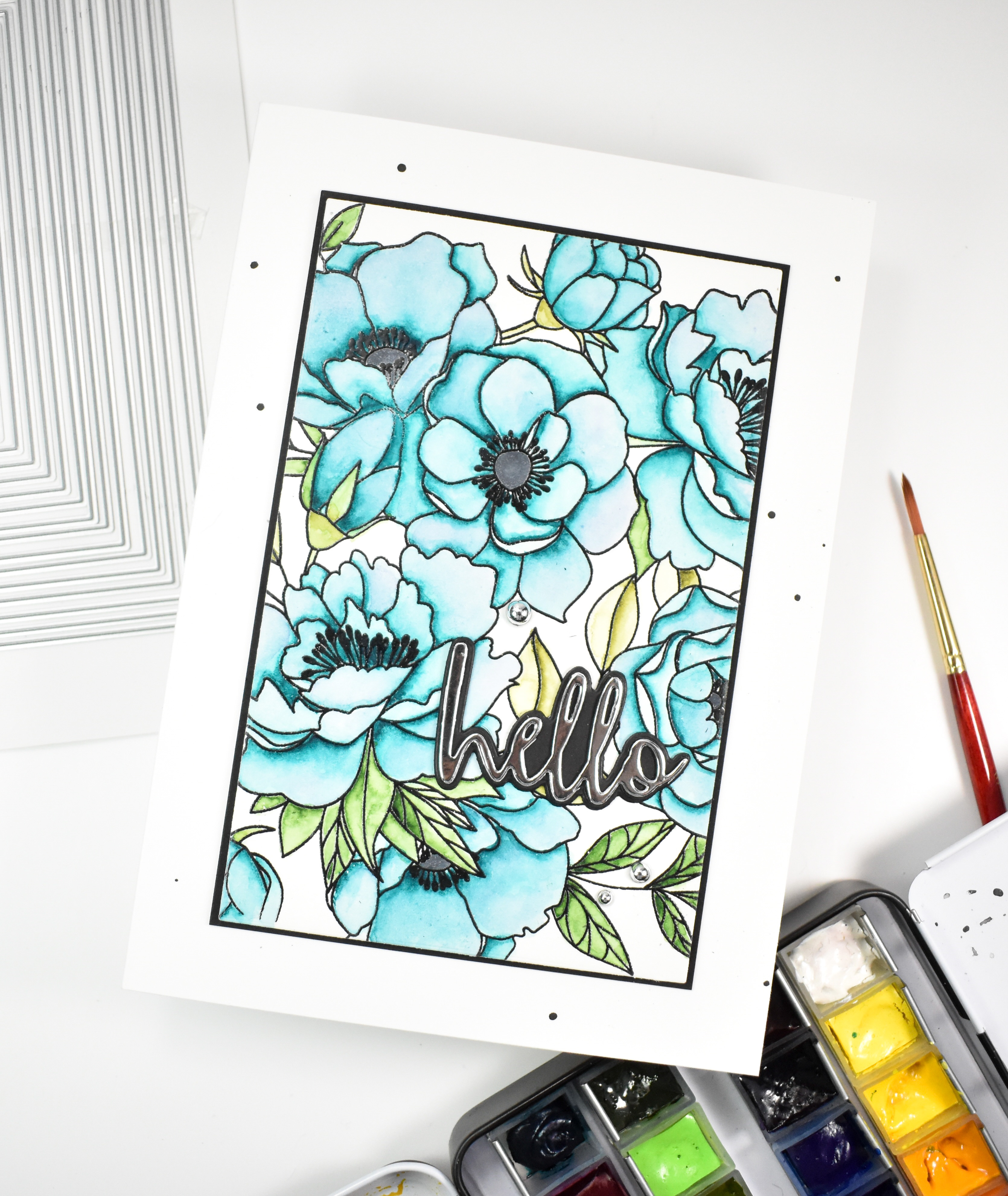 Once I was satisfied, I used the new More A7 Rectangles set to trim it down. I added some foam tape to the back of the panel and adhered it to a black panel for some contrast. I cut my card base, black splattered it and set it aside while I worked on the sentiment. I cut the hello once from silver cardstock and twice from black cardstock, while cutting the shadow portion twice as well. All of those pieces were adhered together before moving on.