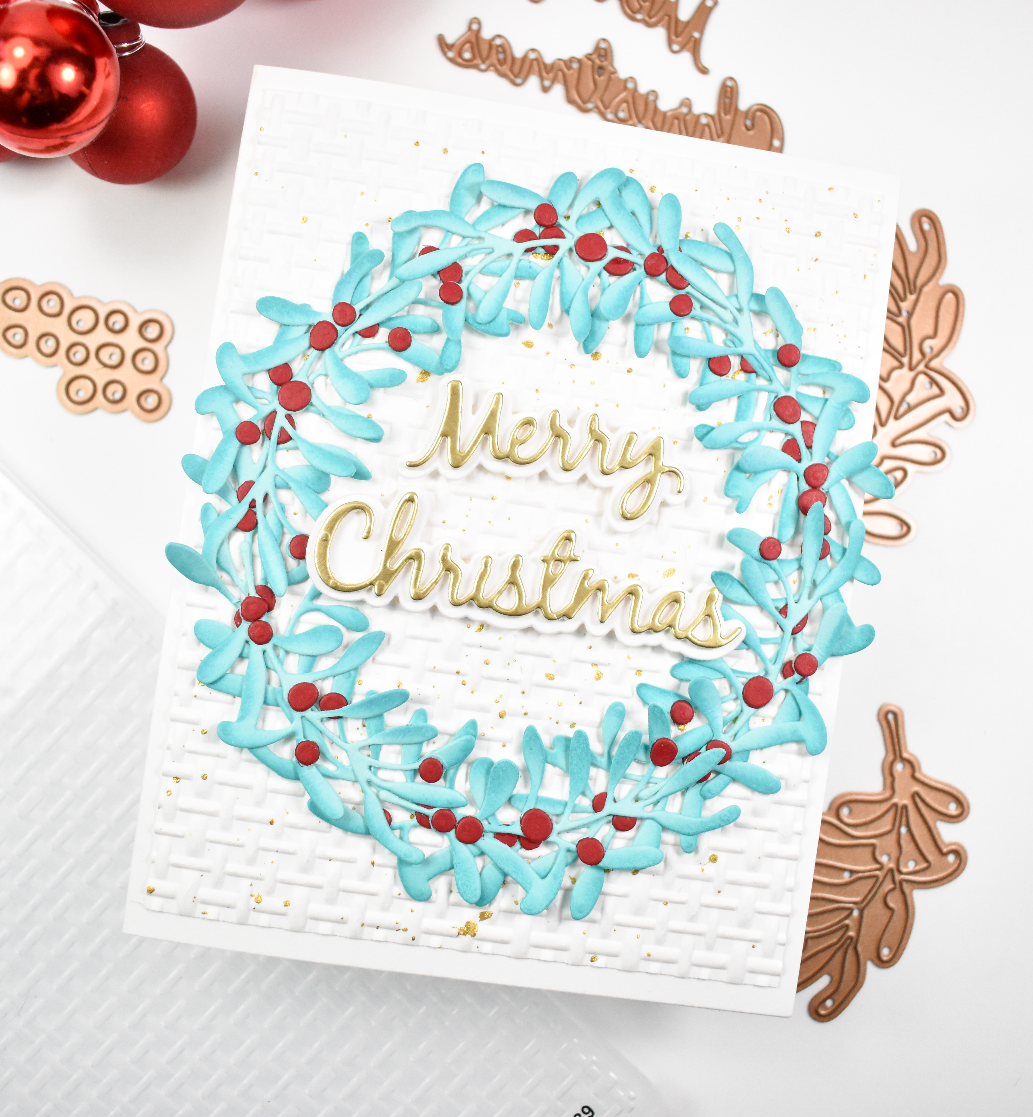 I began this project by die cutting the leaves a bunch of times from Waterfall cardstock, while also cutting the berries from Crimson cardstock. I did some ink blending on the leaves using Surf ink and then adhered the berries to the leaves.