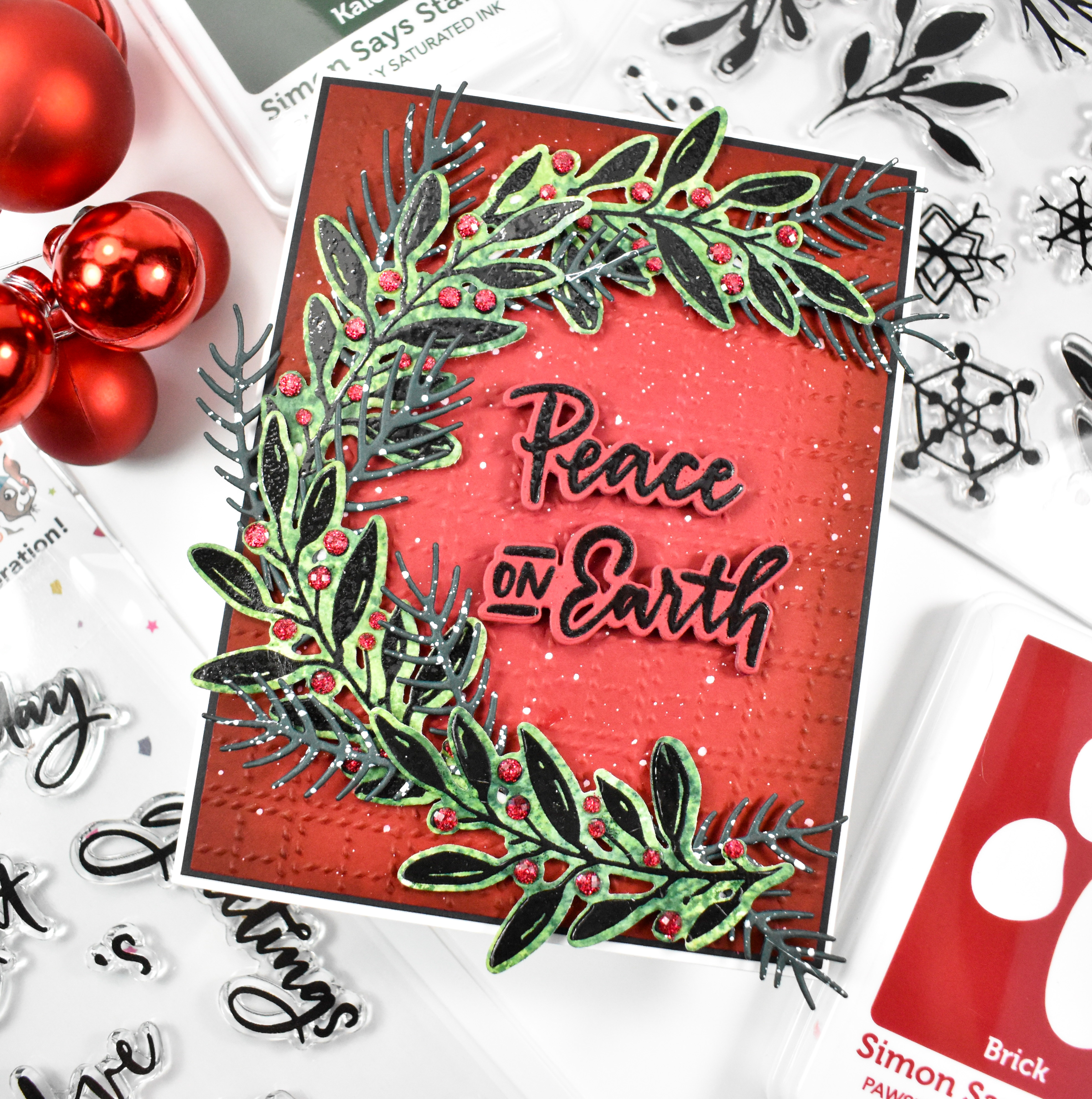 My background was created using a really old embossing folder from Tim Holtz with some ink blending on the edges using Brick ink for some added depth. As I always say, I needed more leaves, so I used the Arching Spruce Sprig from Simon and cut those from Forest cardstock. I took everything over and gave it a good white splatter!