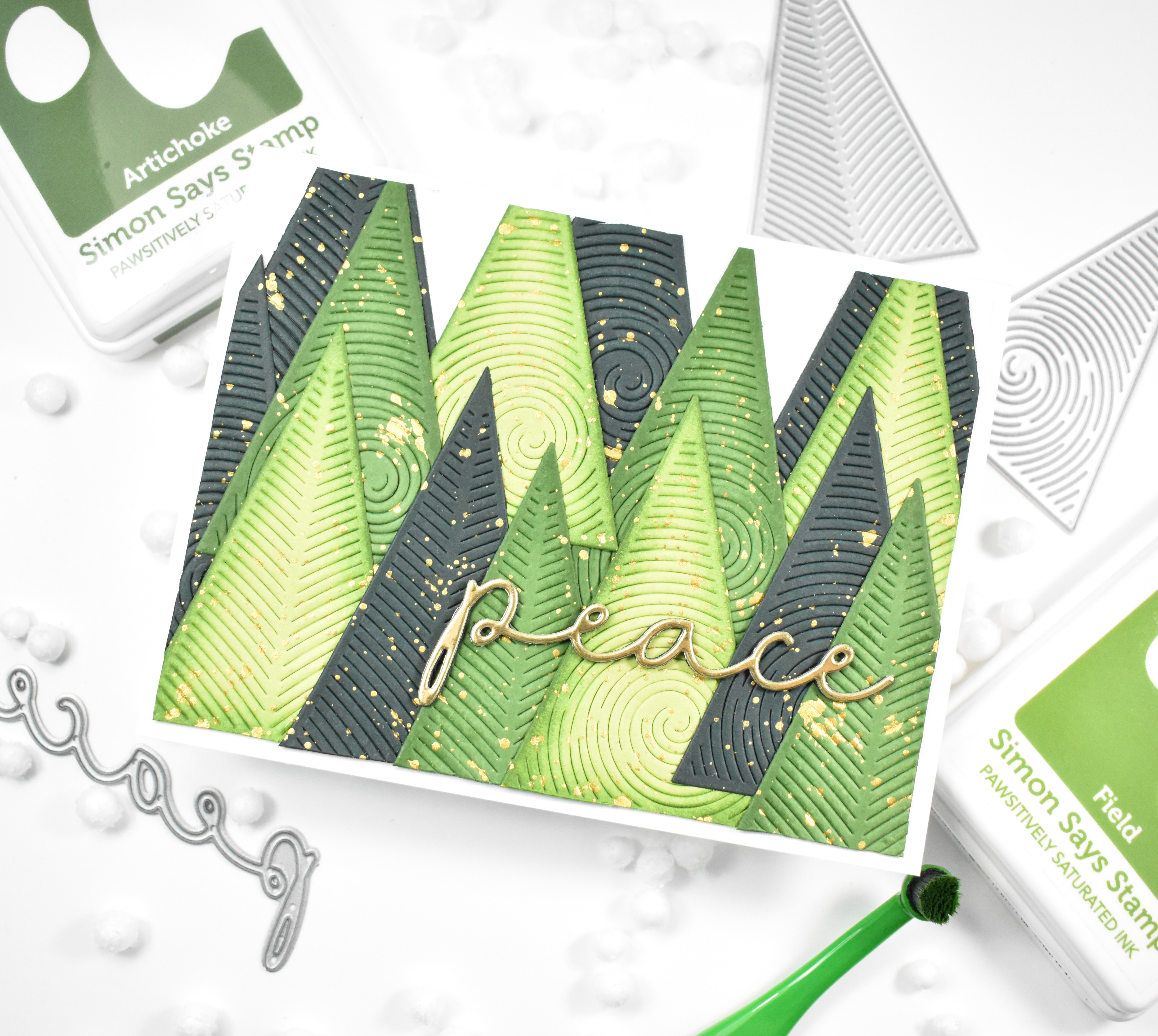 Once I was done with my ink blending, I went ahead and gold splattered all of the trees. While those were drying, I die cut the Simple Peace once from gold cardstock and twice from the Forest cardstock, adhering all of those together for a stacked sentiment. I cut a panel of cardstock and arranged my trees and then used Press n Seal to pick them all up.