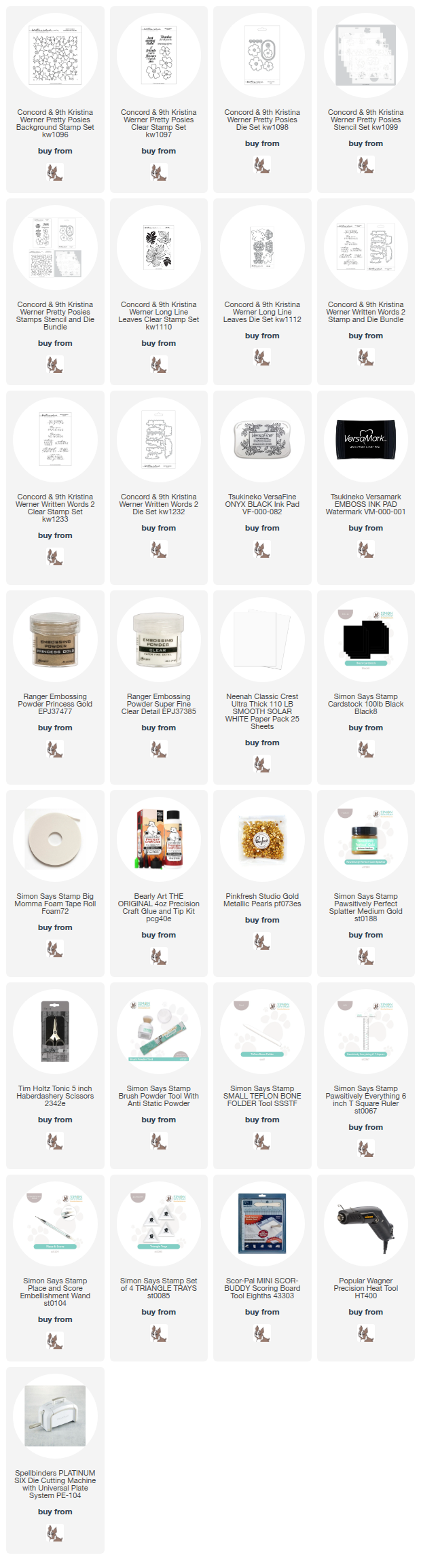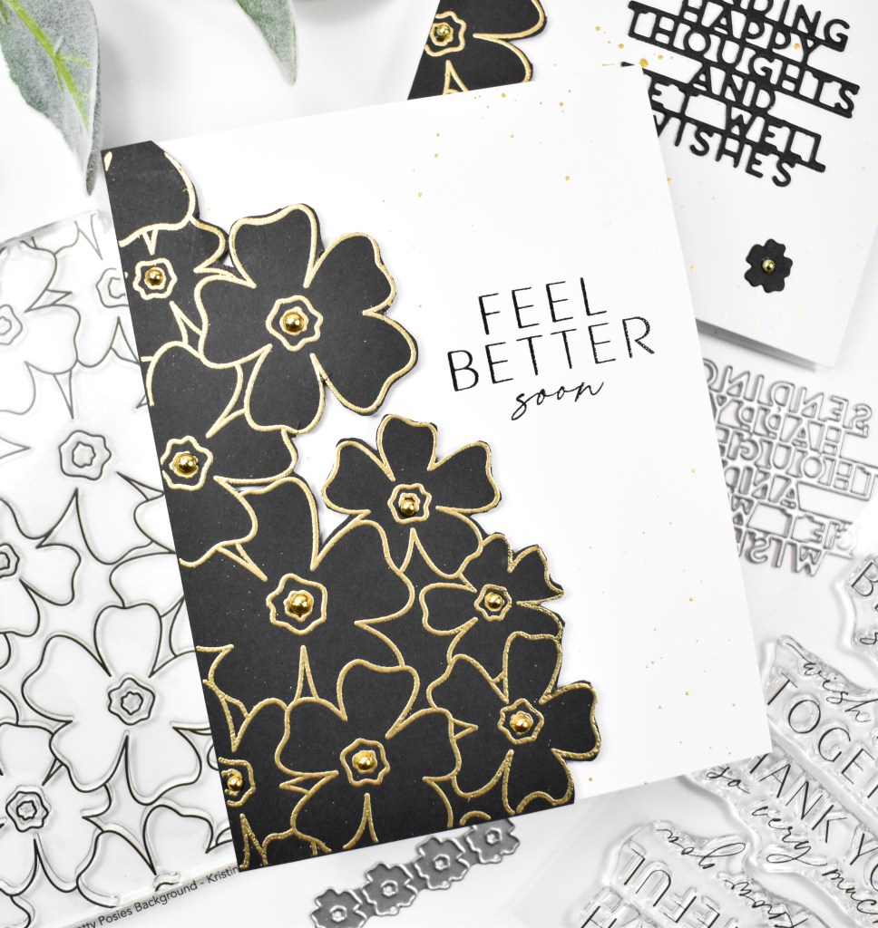 For this month’s project, I opted to use several products from Kristina including the Pretty Posies Background Stamp, along with Pretty Posies Dies, Written Words Stamps and the Long Line Leaves Dies. My design ended up being a twofer, hence using multiple sentiment sets. Let’s go through the detail