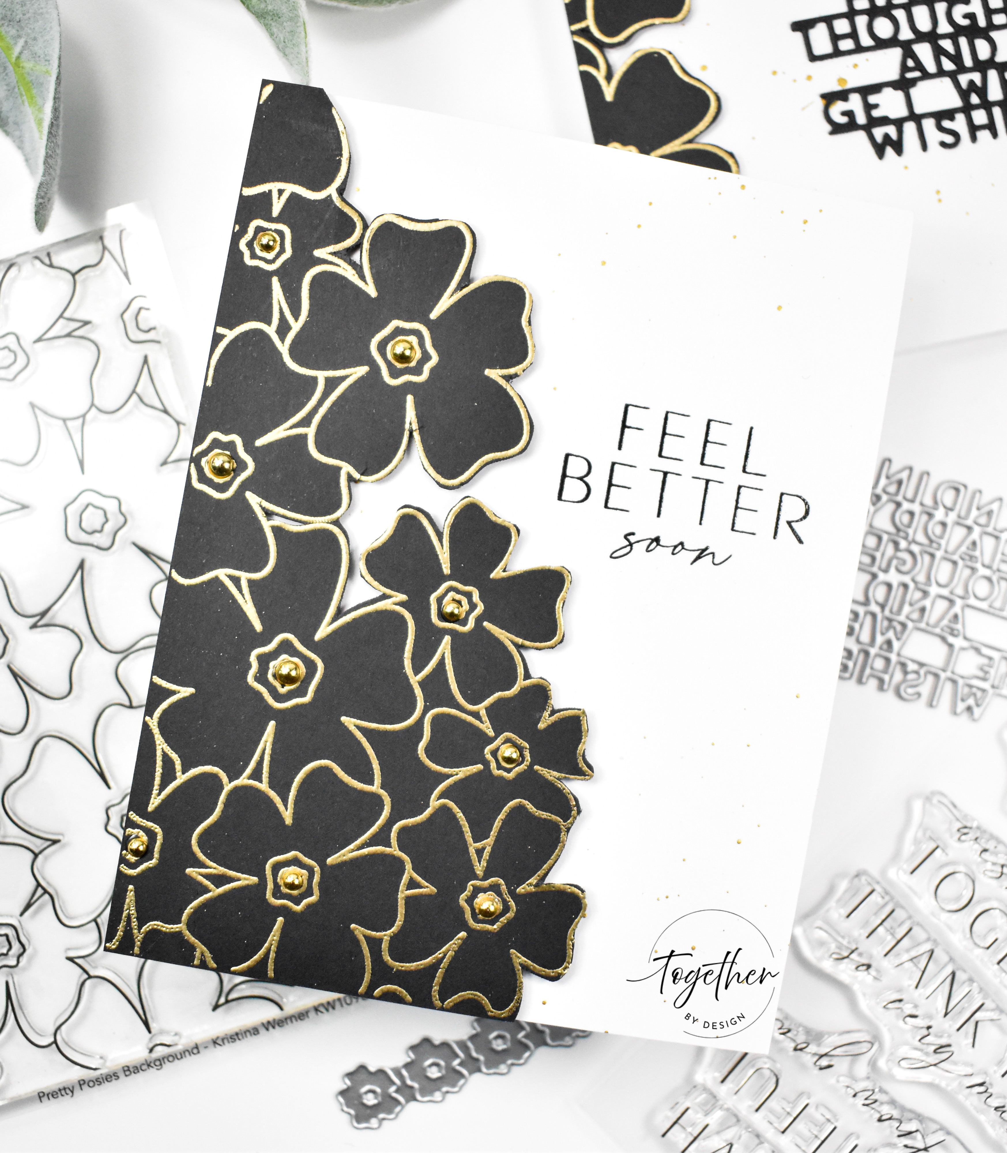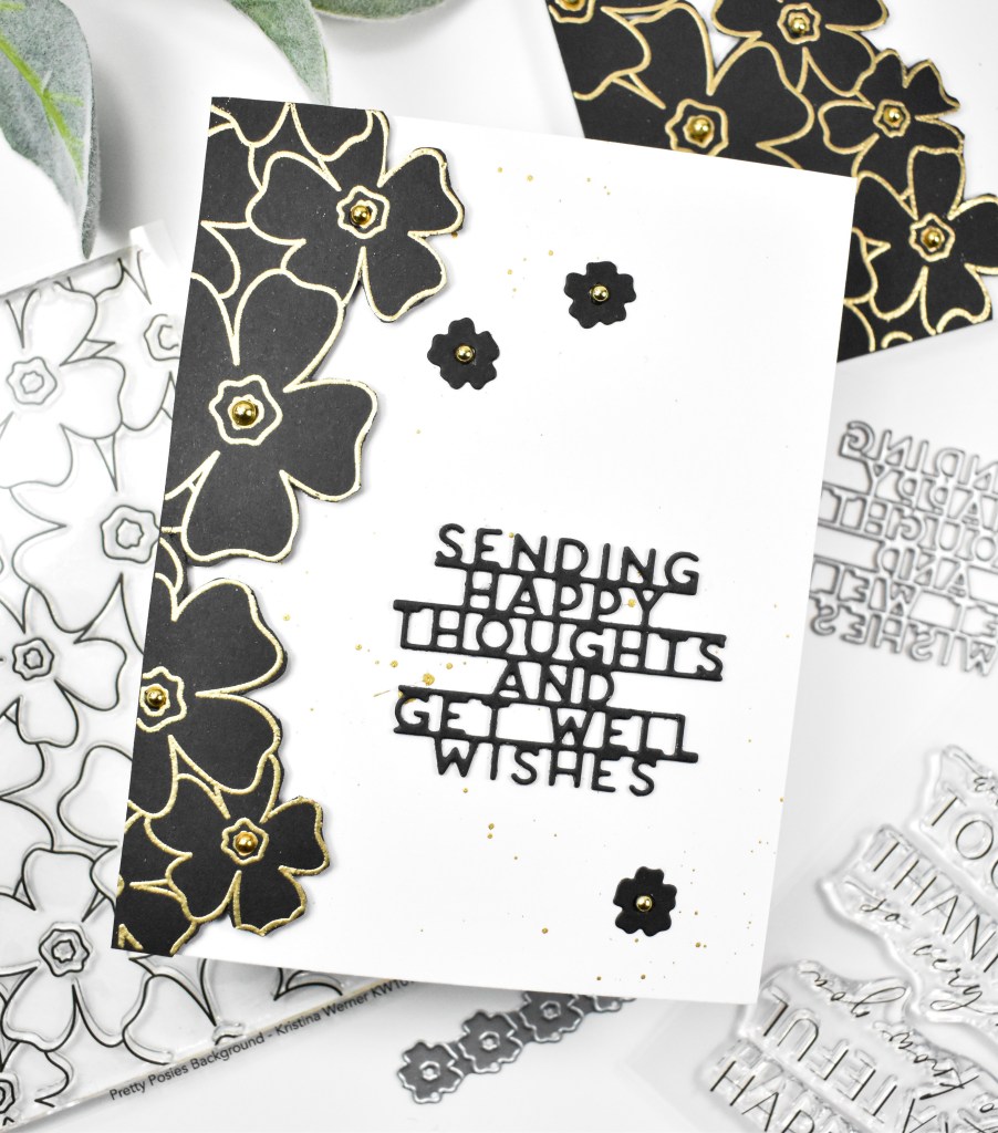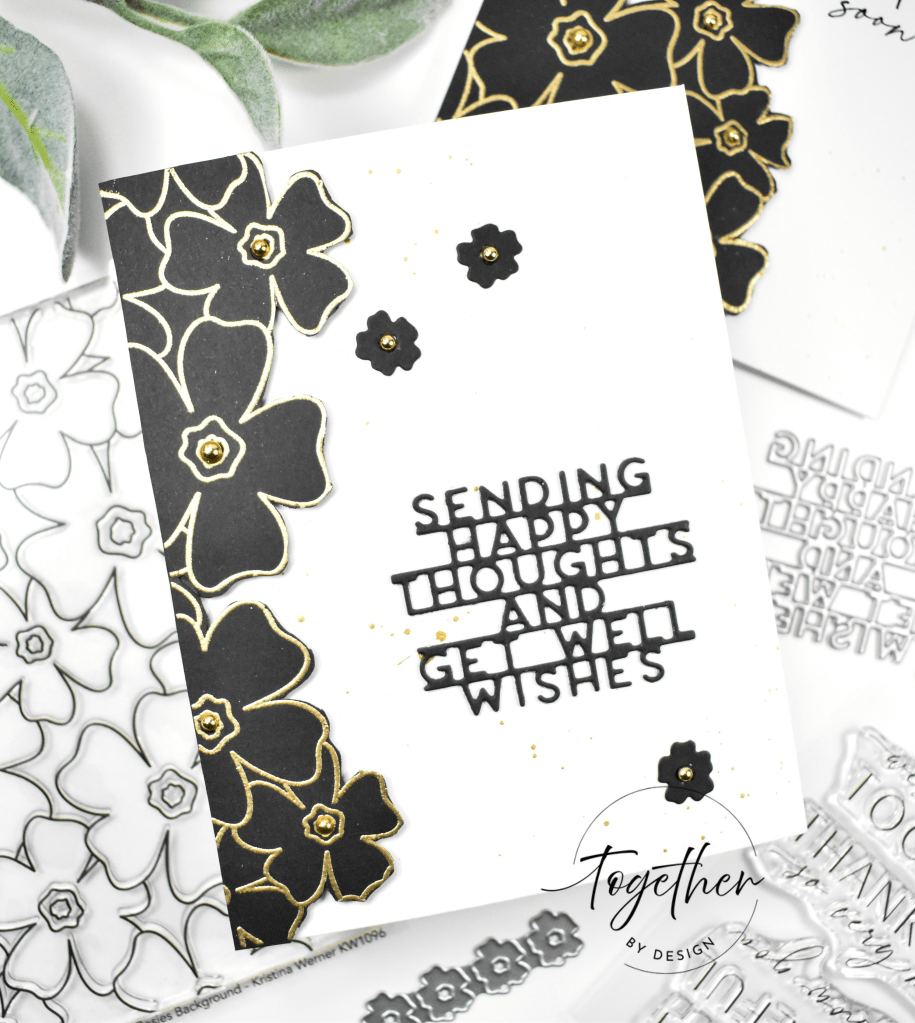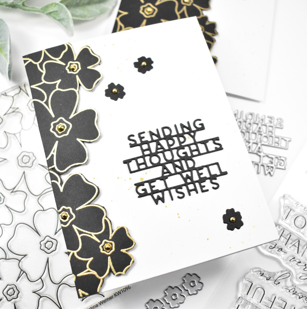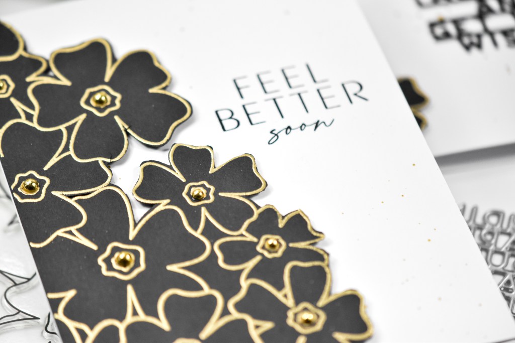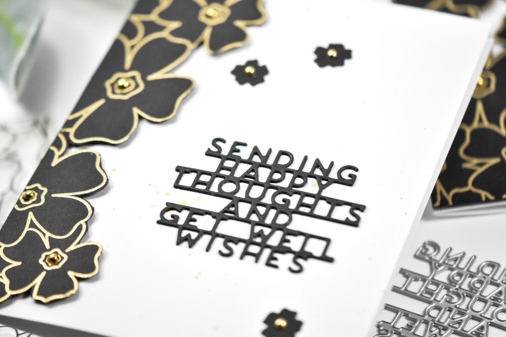 I die cut the sentiment for the other card three times using the same black cardstock for a stacked sentiment look, along with three small flowers for added interest. To finish up, I added some gold gems to the centers of the flowers.