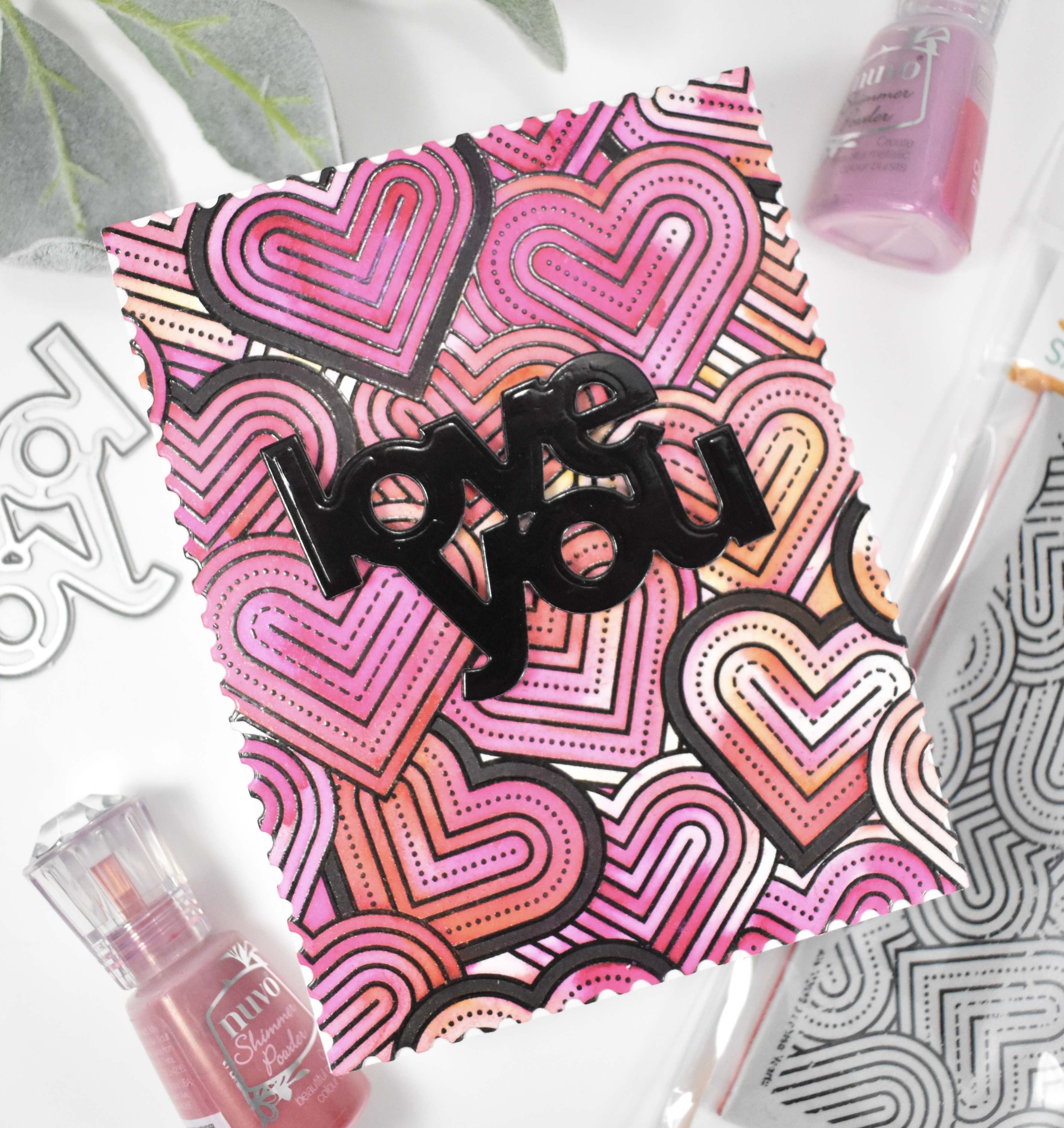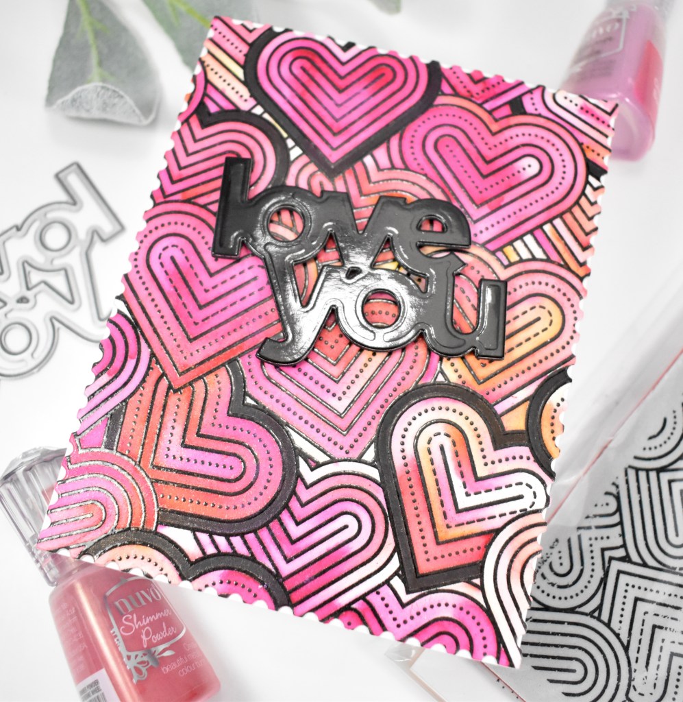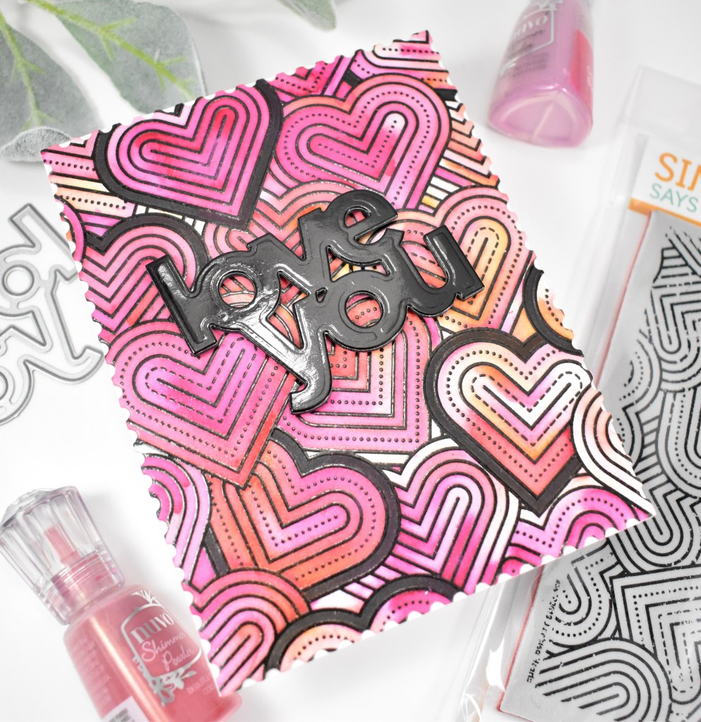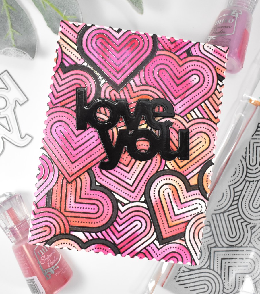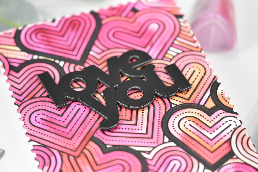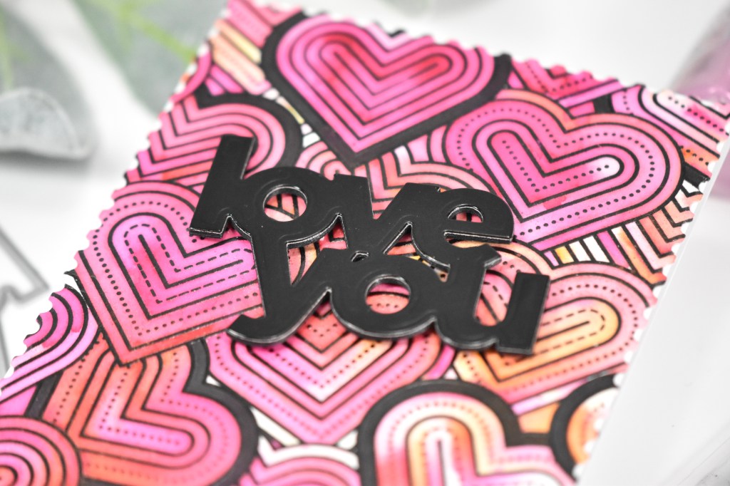 Once the panel was dry, I used the A2 Postage Rectangles to trim it down, and then added some black to some of the hearts using a Copic Marker. The sentiment was cut once from glossy black cardstock and three times from regular black cardstock. Those were all adhered together for a stacked sentiment and then adhered to the panel using foam strips.