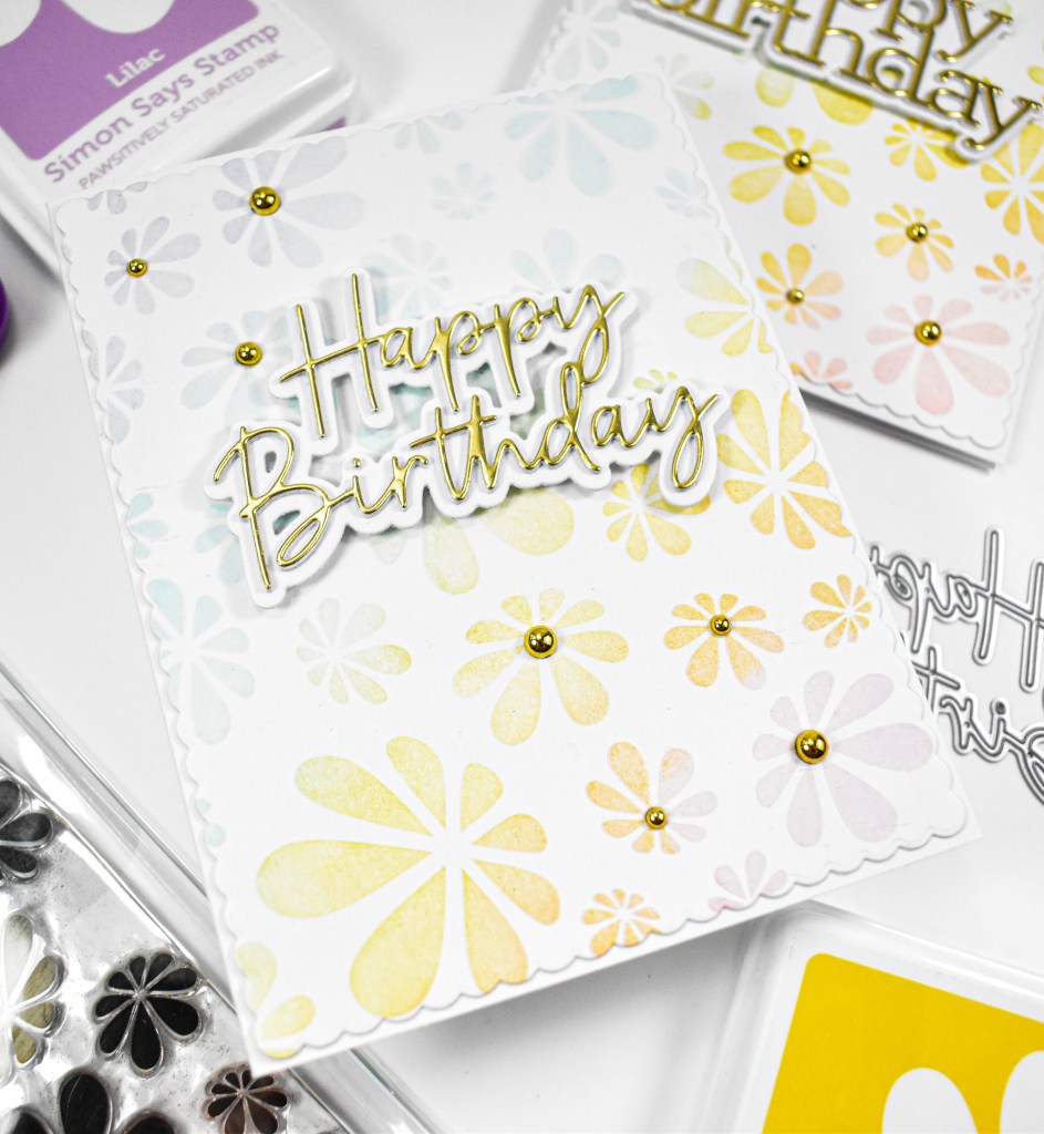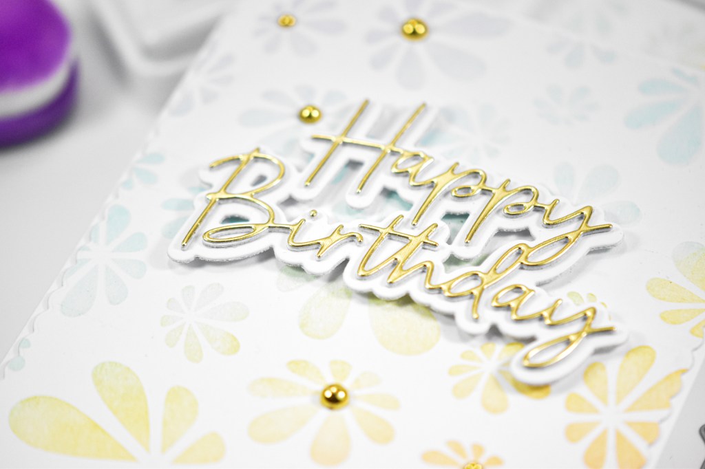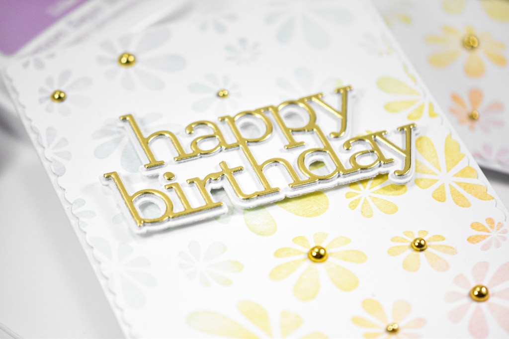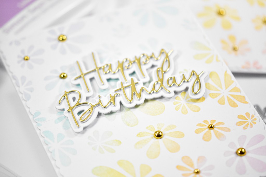 The panels were adhered to the card base, the sentiments were adhered using foam strips, and some gold metallic pearls were added to a few of the flowers to finish up.