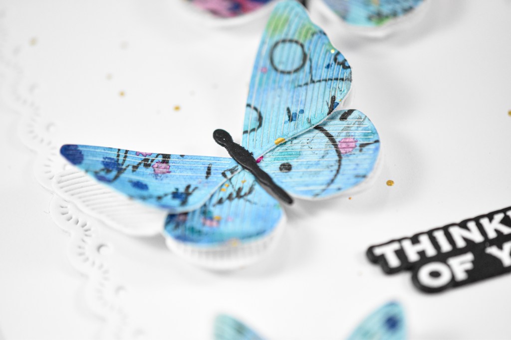 The butterflies were cut from the watercolor panel, as well as from white cardstock, while the bodies were cut from black cardstock. Those were adhered together and foam tape was placed on the back. The panel was created using the Eyelet Layer Frames with more gold splatter to bring everything together. The sentiment was stamped, stacked and adhered to the panel using liquid glue, and the butterflies were added to finish up.