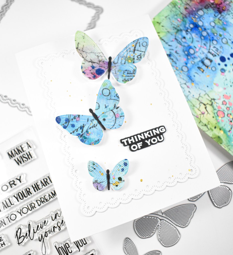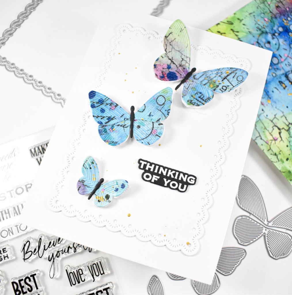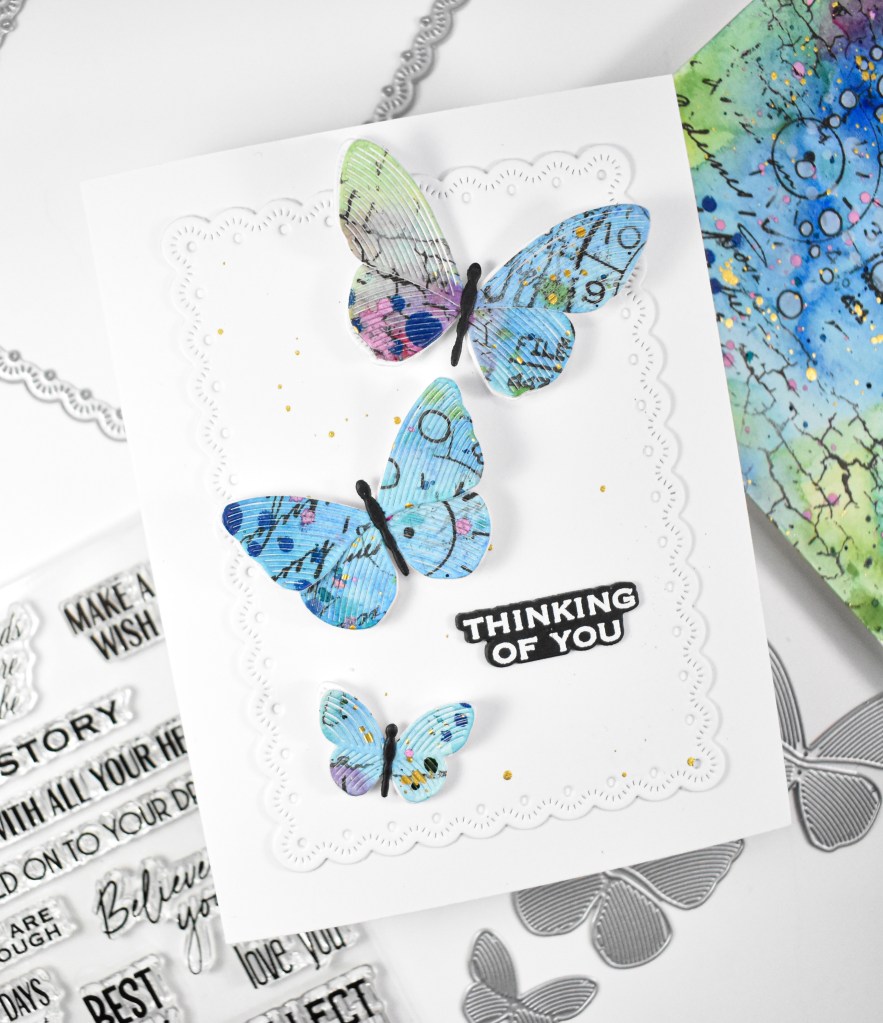 Hello Friends, and welcome back! I’ve had so much fun creating large watercolor panels with various stamping, drawing, splattering, etc lately! I made this panel using blues, greens and a little bit of pink, and I thought the Whirl Butterflies would be cool cut from it. Let’s go ahead and quickly run through the details.