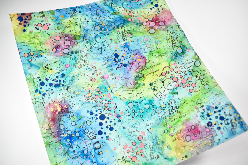 The watercolor panel measures 9 x 12 inches, so I have lots to create cards with! I first added the watercolors to the panel beginning with one color and then adding the next color. I didn’t worry about drying the panel between applications, because I love when the colors blend together. Once I was satisfied with the colors, I let the panel completely dry before moving on to the next step.