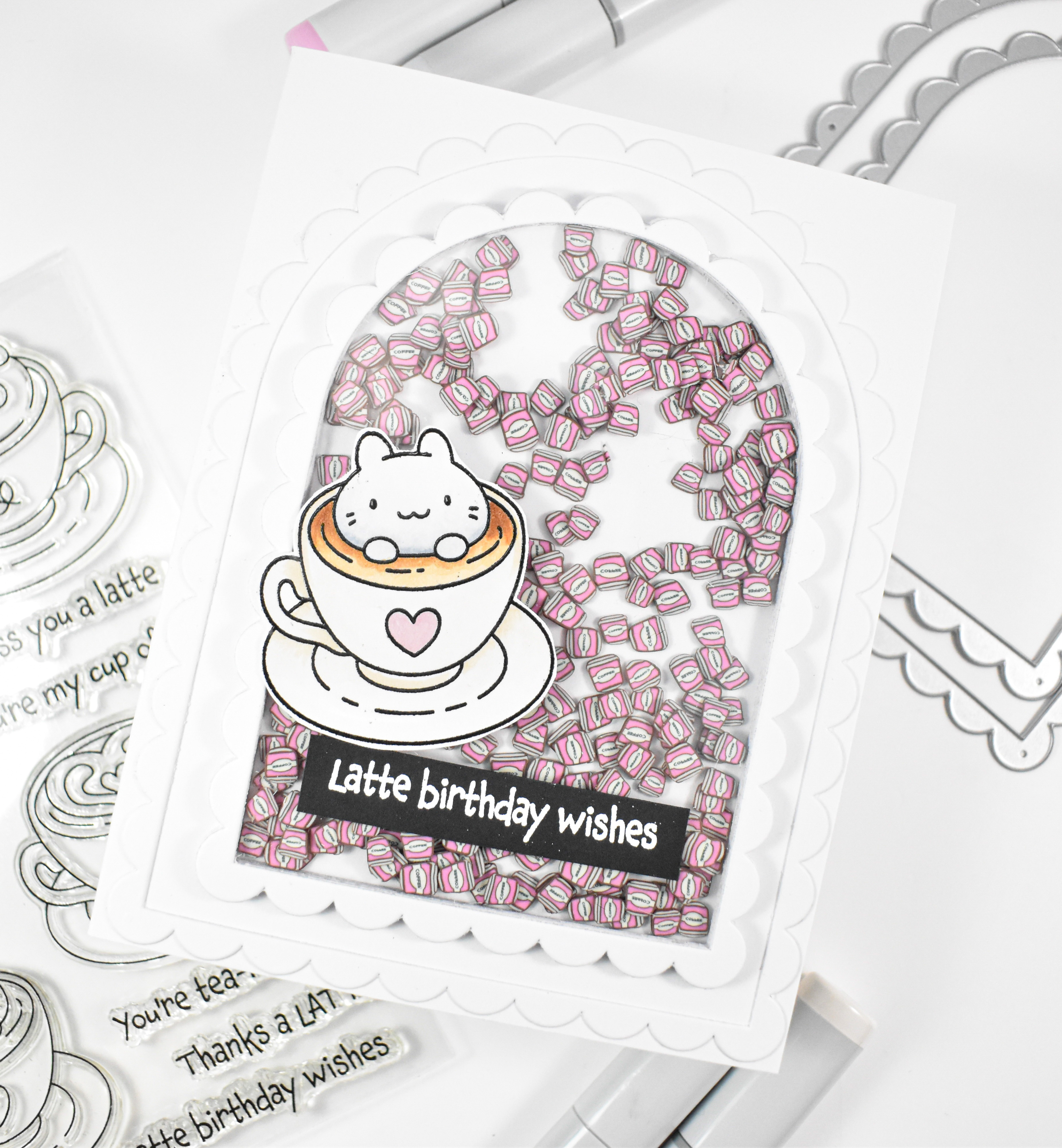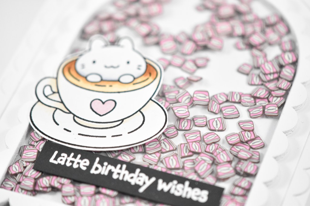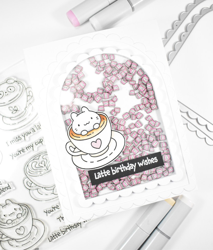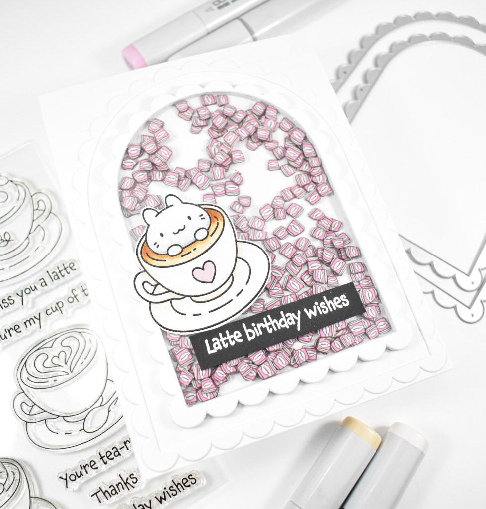When I saw the arches, I immediately thought of a shaker card, so that’s what I set out to create! I thought some cute coffee shaker bits would be fun, but I didn’t have any of those! So, Etsy to the rescue! I stamped the critter from the Thanks a Latte set with VersaFine Onyx Black ink, heat embossed it with clear powder, colored it with Copic markers and fussy cut the image. As a note, there are coordinating dies for this set. I also went ahead and stamped the sentiment onto black cardstock using VersaMark ink, heat set that with white powder and trimmed it down into a strip.