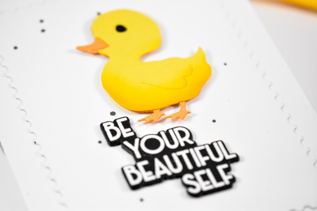 The background was created using the A2 Postage Rectangles with some black splatter for added interest. The sentiment was stamped using VersaMark ink, heat set using white embossing powder and trimmed out several times for a stacked look. The panel was adhered to the card base, the sentiment was glued in place and the duckling was added with foam tape for added dimension.