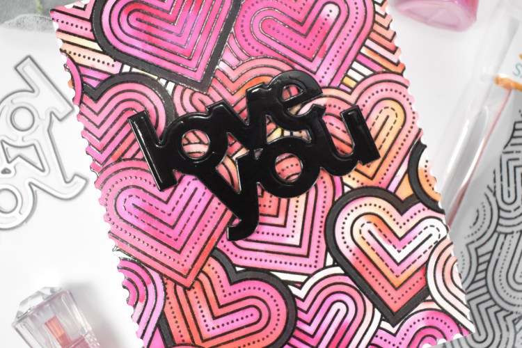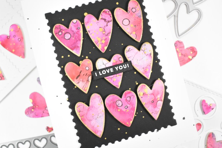 Once the panel was dry, I used the A2 Postage Rectangles to trim it down, and then added some black to some of the hearts using a Copic Marker. The sentiment was cut once from glossy black cardstock and three times from regular black cardstock. Those were all adhered together for a stacked sentiment and then adhered to the panel using foam strips.