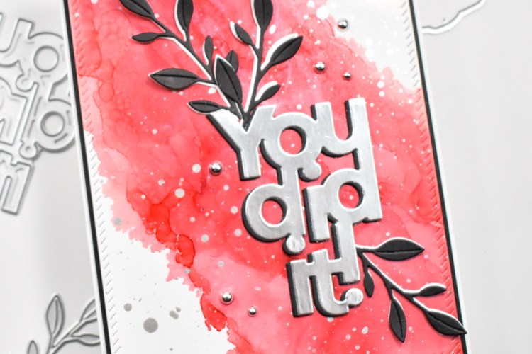 I die cut the SSS You Did It once from SSS Matte Silver cardstock and twice from black cardstock and adhered those together using liquid glue, but offsetting them just slightly to create a shadow effect. As I always say, every card seems to need leaves and this one was no exception. I used the SSS Etched Meadow Flower and Leaves to cut a few leaves from black cardstock, as well as Neenah Classic Crest 110lb cardstock.