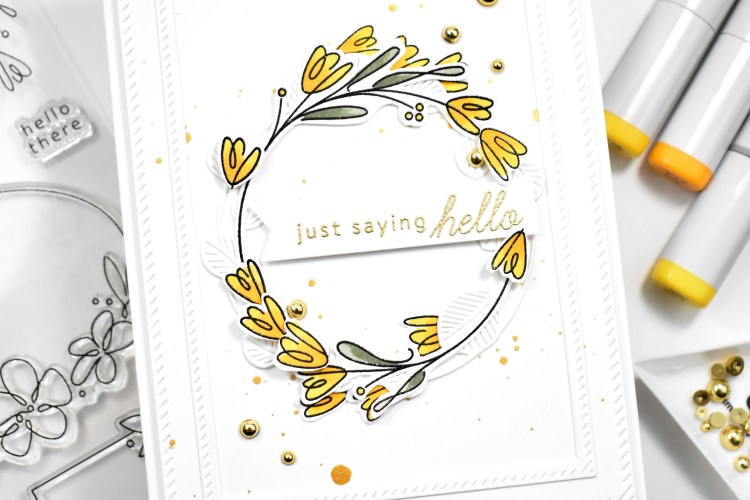I began by foiling the Sketched Floral on a panel of Neenah Classic Crest 110lb cardstock using Spellbinders Champagne Hot Foil. Once the foiling was done, I trimmed the panel using PinkFresh Studio Diagonal Stitched Rectangles, and began coloring the piece. The Copic markers that I used were RV10, RV91, RV93, RV95, G21, G24, G85, Y08, Y17 and Special Black 110. Coloring the background black is a technique that I saw Yana Smakula do a long time ago, and I just love the drama and contrast that it provides.