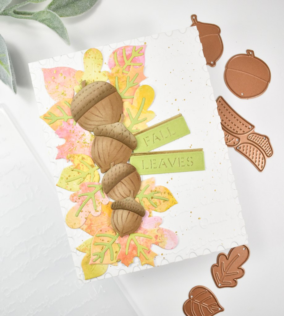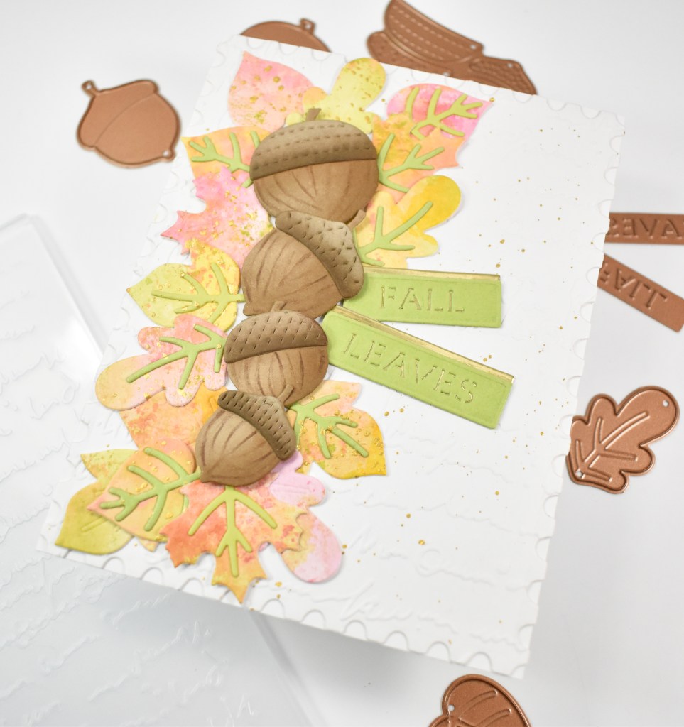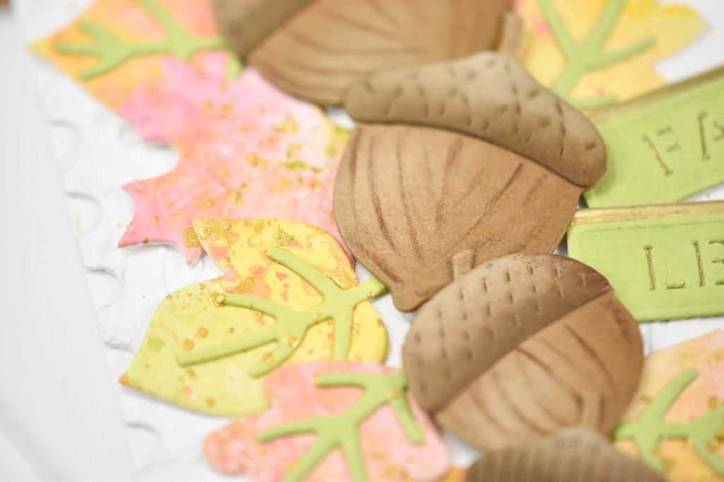 The background was adhered to the card base and then I began adhering to the leaves, tucking them in around the acorns. The acorns were adhered using foam tape, and the sentiment was secured with liquid glue to finish up.