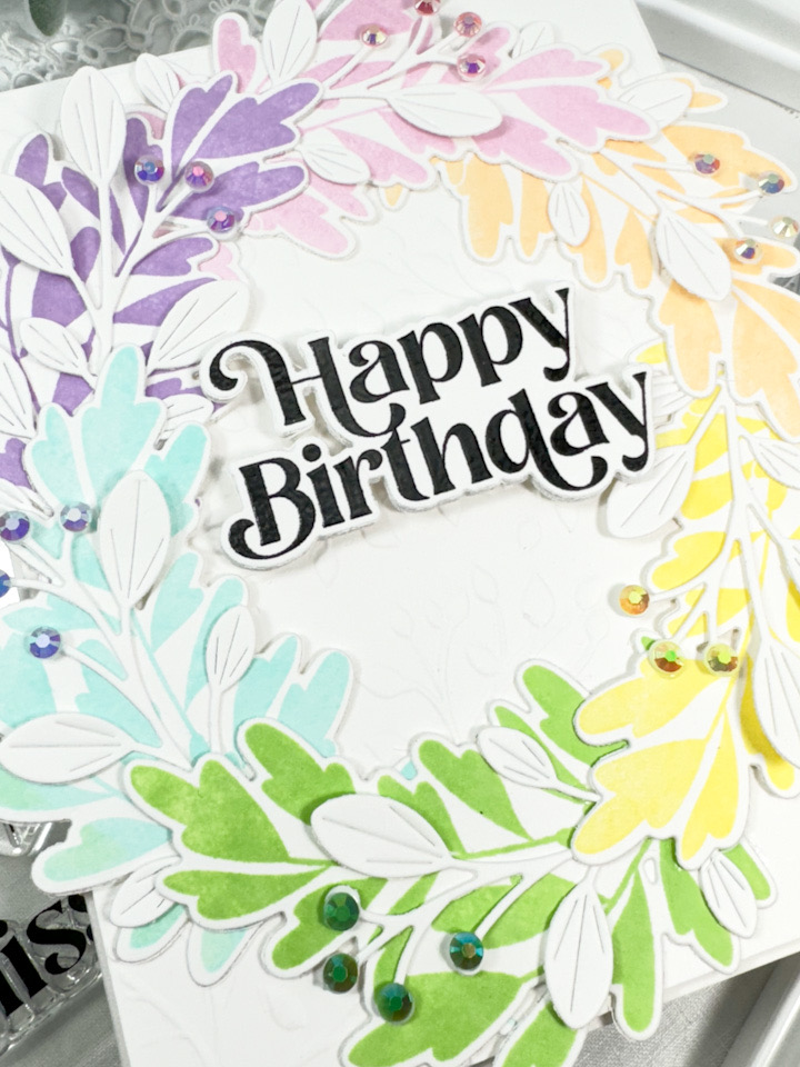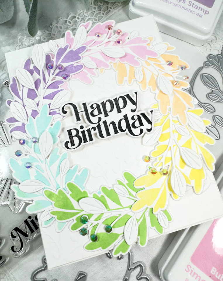I began this project by ink blending a panel of Neenah 110lb cardstock using SSS Pawsitively Saturated Inks in Bubblegum, Sunbeam, Seafoam and Lilac. Once the ink blending was complete, I put the panel in the folder and ran it through the machine.