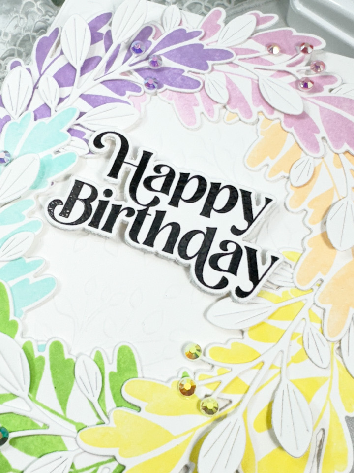 For the sentiment, I used the new SSS You die cut and cut that once from black glossy cardstock and twice from regular black cardstock and adhered all the layers together using liquid glue. I stamped the happy birthday portion, which is from the new SSS You stamp set, onto a scrap of black cardstock using VersaMark Ink and heat set that using SSS Detail White Embossing Powder. The You portion was glued to the panel, while the birthday portion was adhered with SSS 3D Foam Strips.