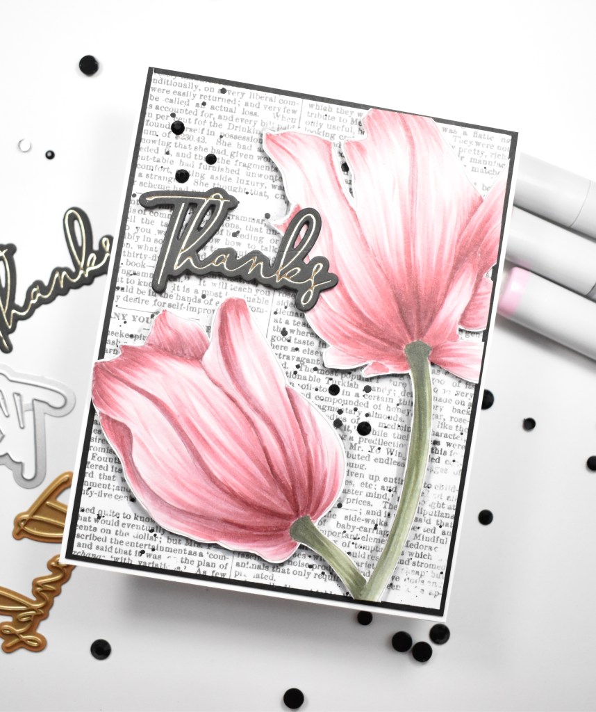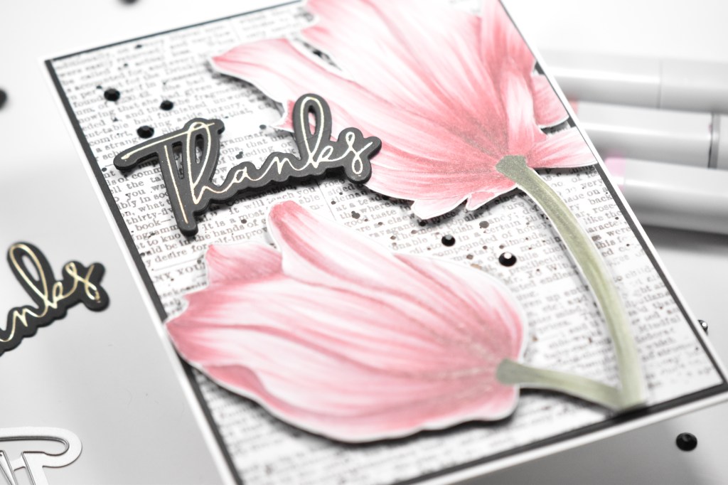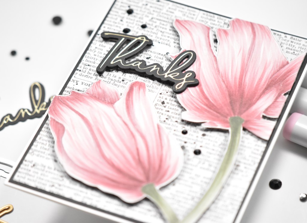 I applied foam tape to the tulips and adhered those to the text background, which I splattered using Royal Talens Oxide Black Acrylic Ink, trimming off any excess of the flowers. After those were on, I used the Copic markers in N0 and N2 to add shadows around the flowers. The text panel was then adhered to a black panel using SSS Dot Tape Runner, and that was then adhered to the card base. I adhered the sentiment using a combination of foam tape and liquid glue, and also added a few black jewels to finish up.