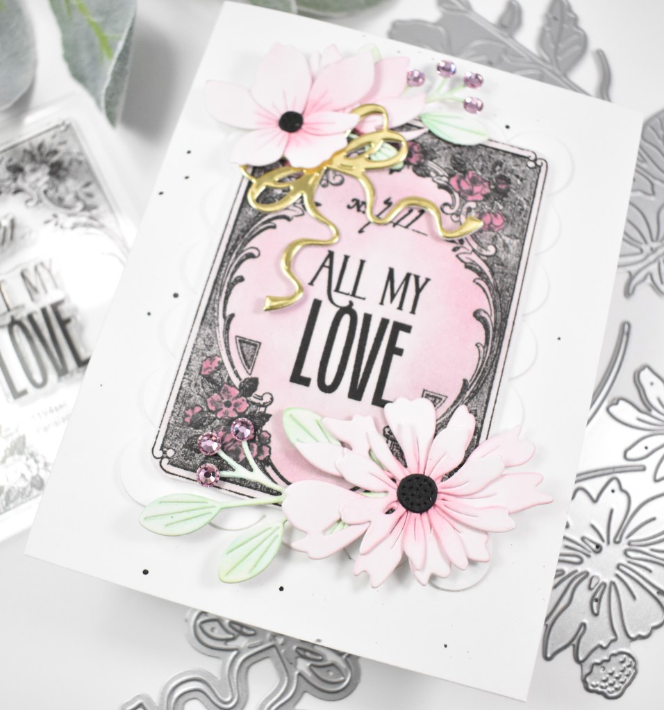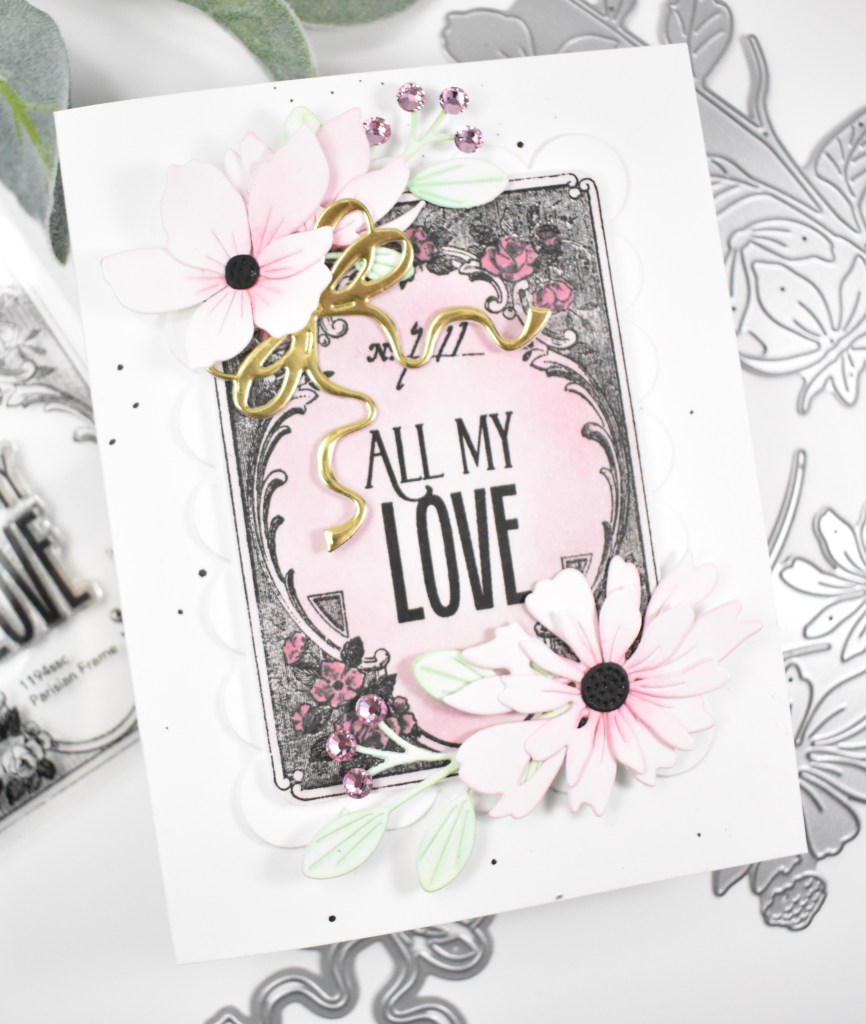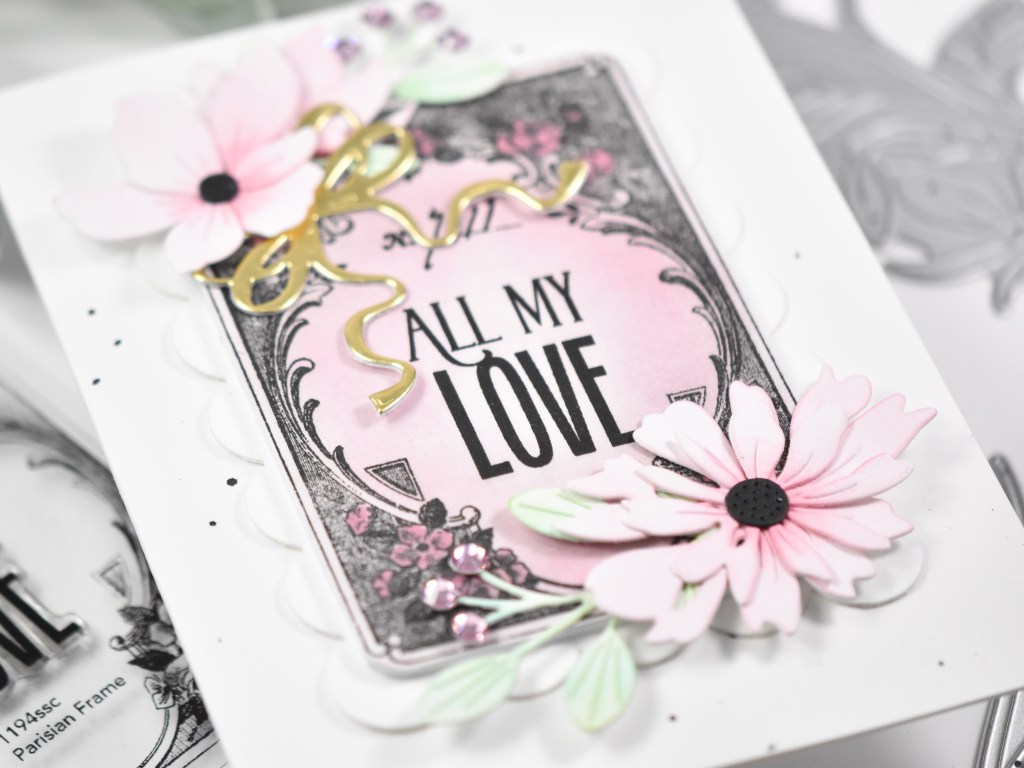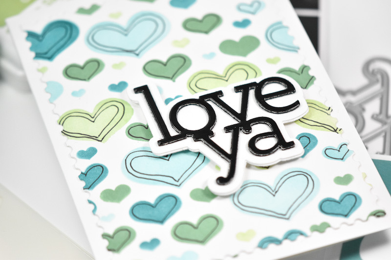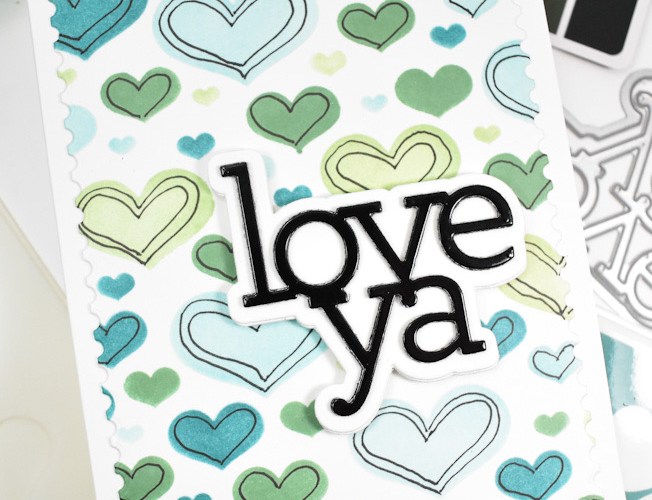 I die cut the ilysm sentiment once from black glossy cardstock and twice from black cardstock, while cutting the shadow portion twice from Neenah. All of those were adhered together and glued directly to the card. The sub sentiment was stamped using VersaMark ink, heat set with Detail White Embossing Powder, trimmed down and adhered with foam tape to finish up.
