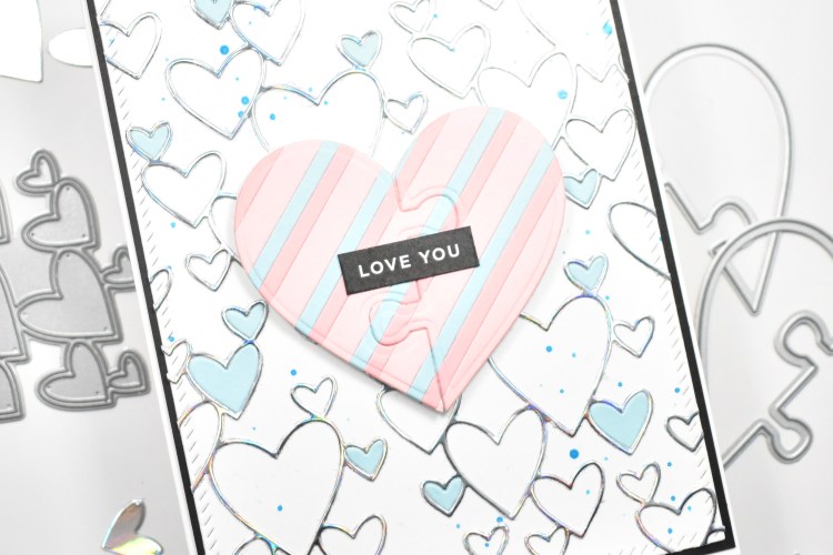 I thought the panel needed a frame, so I used the PFS Folk Edge Rectangles and cut one of those from black cardstock and glued it to the background panel. Moving on to the sentiment, I used the SSS XL Love Greetings and stamped on black cardstock using VersaMark Ink and heat set that using SSS Detail White Embossing Powder. I then used the coordinating die to trim that out, along with two additional cuts for a stacked sentiment.