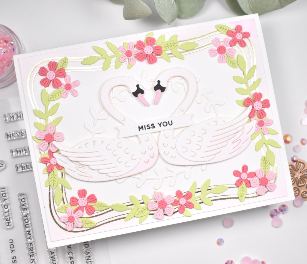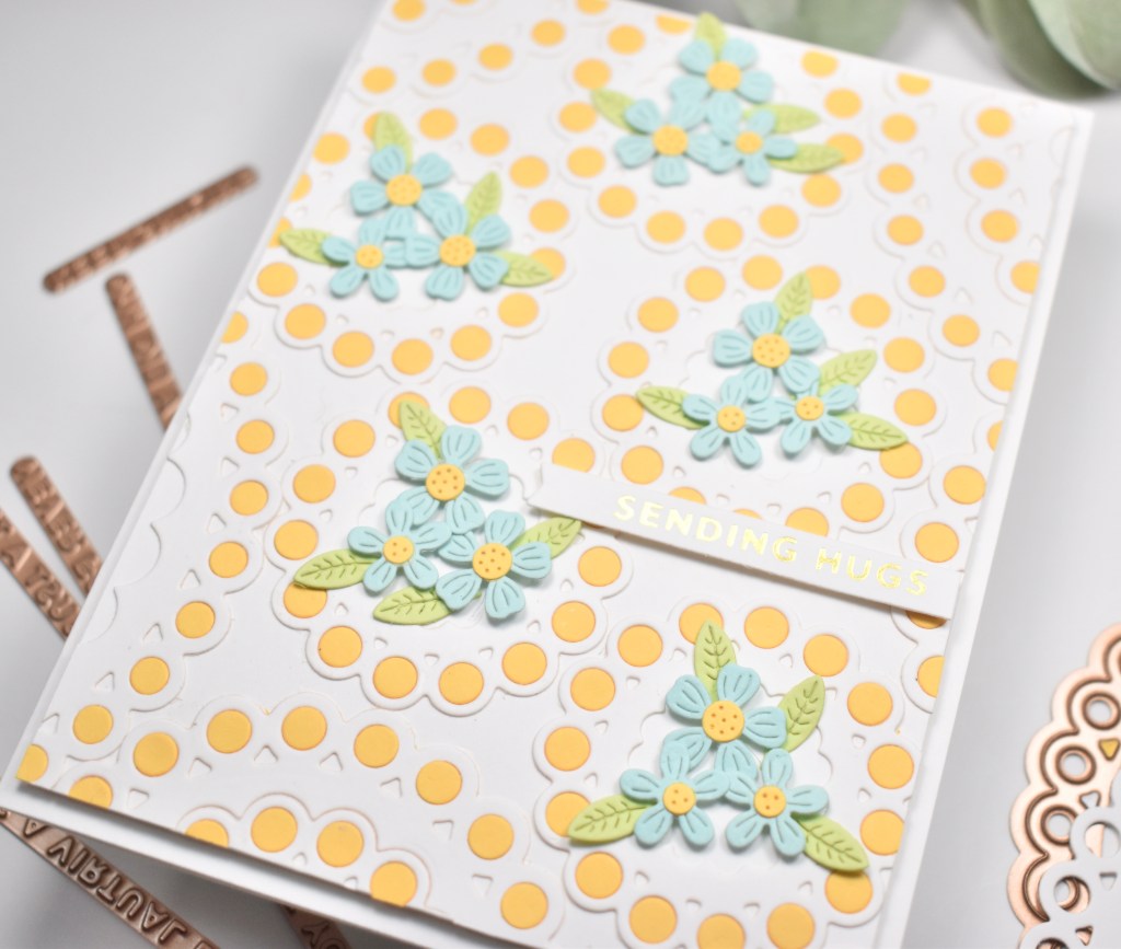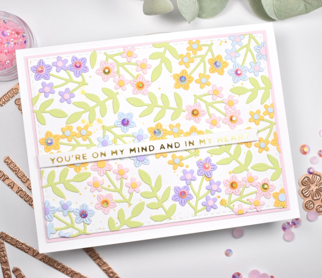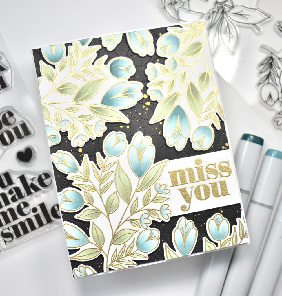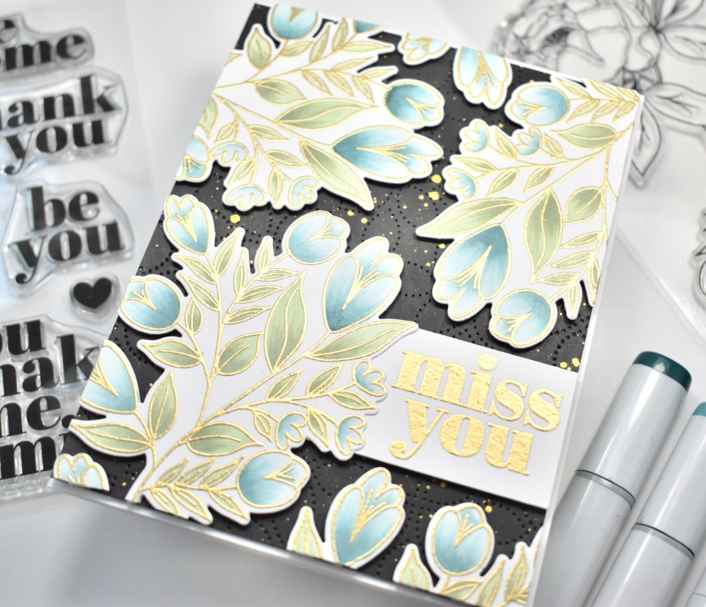 I used the miss you sentiment from the new SSS Little Banner Basics set, die cut the sentiment twice from Neenah 110lb cardstock, cut the shadow portion twice from black cardstock and adhered all of those pieces together with liquid glue. I adhered the black panel to the card base using foam tape, glued the flower pieces in place and adhered the sentiment atop that using SSS 3D Foam Strips.