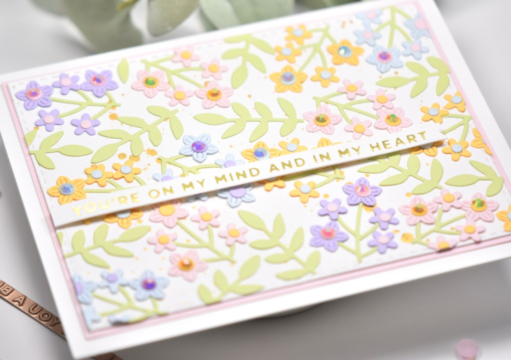 I began this card by die cutting the SSS Charming Daisy from some Neenah 110lb cardstock and doing some ink blending using SSS Pawsitively Saturated Inks in Celery, Citrine and Pearfection, along with SSS Rainbow Splash Gravel ink.