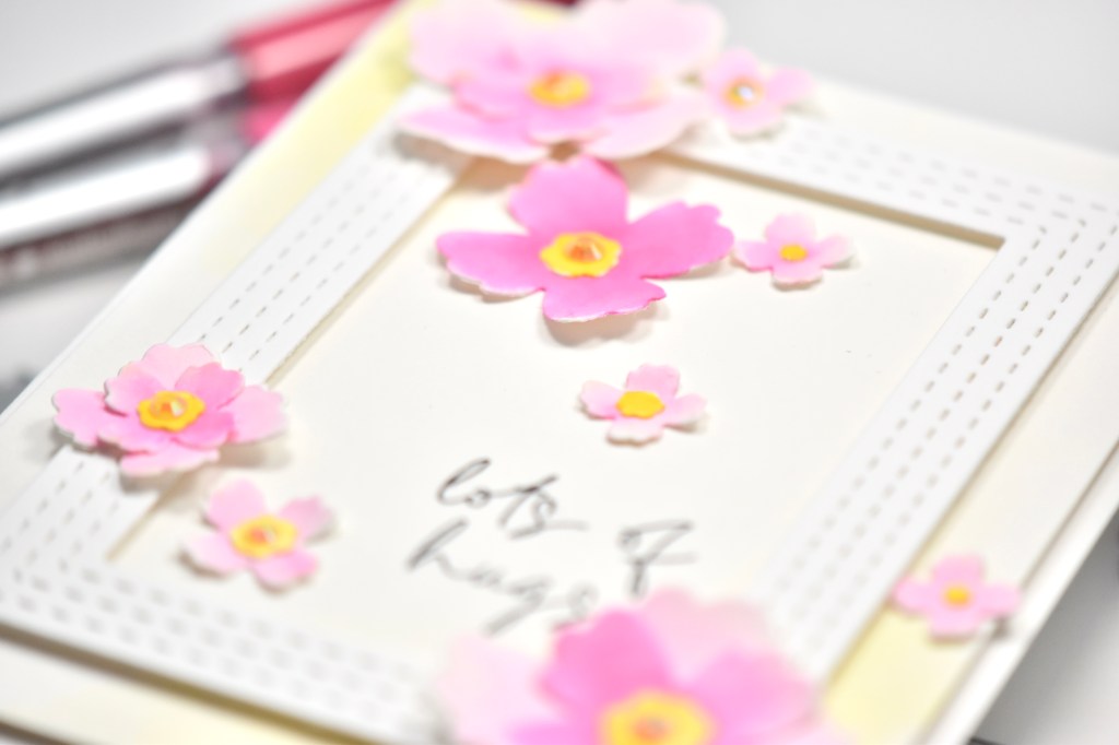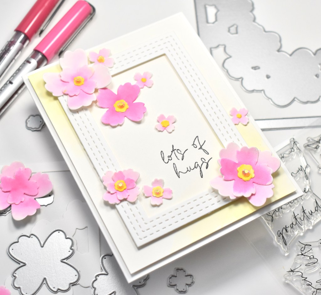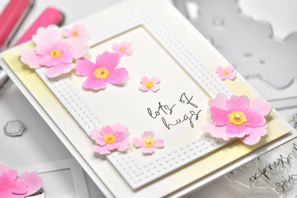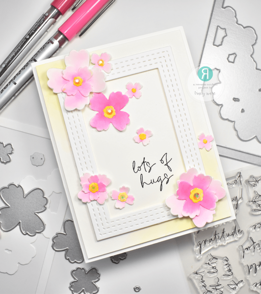 To begin this project, I cut an A2 card base using Neenah Classic Crest 110lb cardstock and added some ink blending using PinkFresh Studio Fresh Pear and Lemon Whip inks, along with some white splatter using Royal Talens Amsterdam Titanium White Acrylic Ink. I love this ink for splatter because it stays bright white, and it has the perfect splatter consistency! I used the Reverse Confetti Stitched Note and Frames Confetti Cuts to cut a panel of Neenah 110lb, and adhered the outside frame to my card base using foam tape.