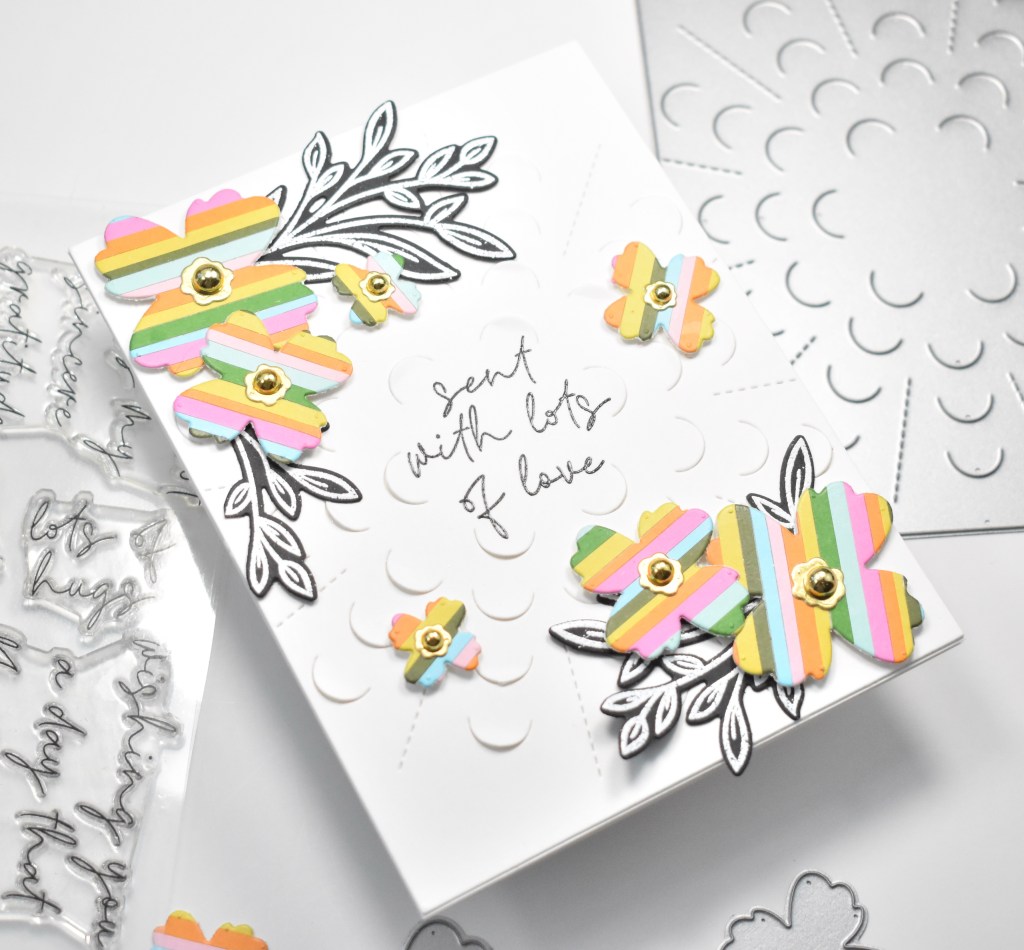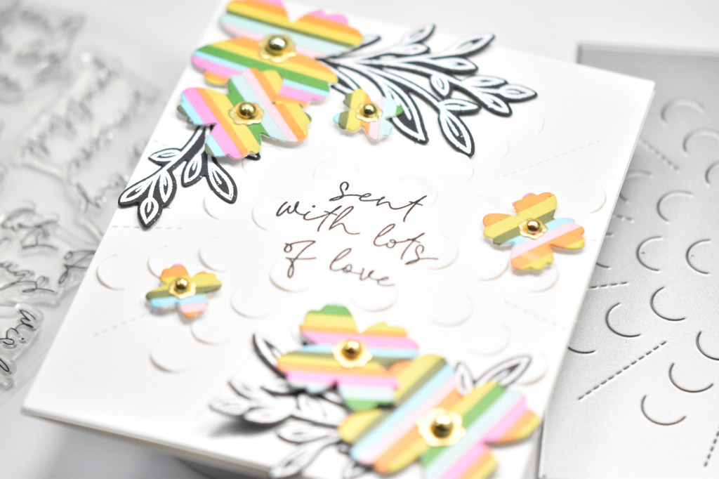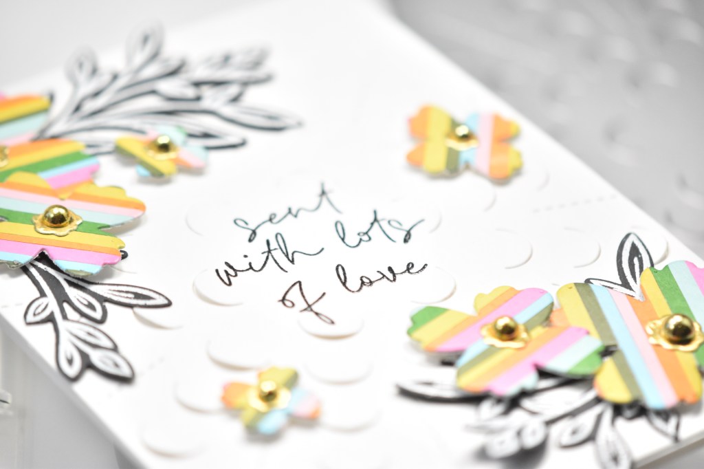 I stamped the Tropical Leaves on my gel print using VersaFine Onyx Black ink and heat embossed them using Ranger Clear Embossing Powder. Once that was done, I used the Tropical Leaves Confetti Cuts die to run those through my die cutting machine. Remember earlier when I said that this gel print was created on thin white paper? Well, my leaves needed some extra thickness, so I ran the leaf die cuts through the machine again using Neenah 110lb and glued those together for sturdiness. Those were then glued to the corners of my card.