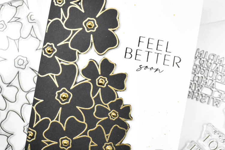 I die cut the sentiment for the other card three times using the same black cardstock for a stacked sentiment look, along with three small flowers for added interest. To finish up, I added some gold gems to the centers of the flowers.